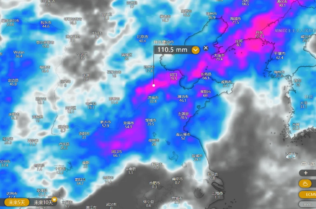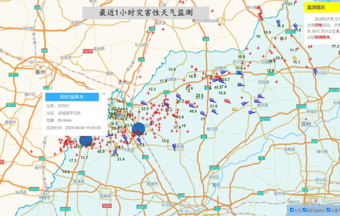 另外,降水区域普遍伴有明显雷暴大风,济南商河龙桑寺镇监测到22m/s的九级阵风;并且上述地区的降水强度非常凶猛,德州武城国家站站1小时最大降雨量甚至达到81.8毫米,
