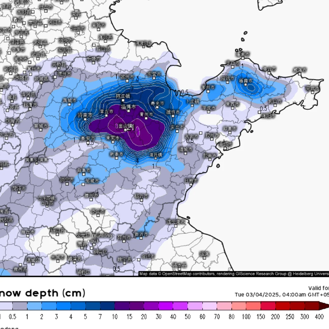 今天晚上河南、山西、陕西一带已经有降水回波发展,并且正在开始影响山东的菏泽一带。明天(2日)凌晨起,山东将自西向东影响一轮大范围的降水过程。 大部地区降水一开始都是以雨为主,中午之后鲁西北、鲁中地区会转成降雪。济南、淄博、潍坊、临沂北部一带可能成为降雪中心,淄博附近最大积雪深度可超过15厘米。 图1~3为不同模式下的积雪深度预测,图4为累计降水量预测。