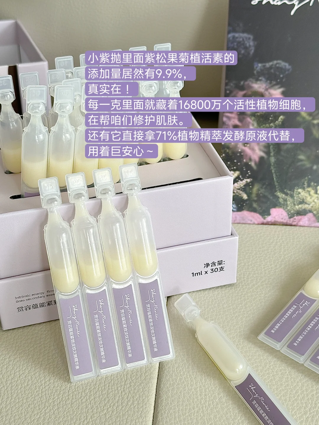 这款小紫抛是意大利实验室联合研发的成果,用料特别扎实。添加了9.9%紫松果菊植活素,每克里有16800万个活性植物细胞,再加上71%植物精粹代替普通溶液,一边修护,一边K老,又能K氧化、抗火火,堪称护肤界的“六边形战士”,就冲这成分,试用后果然上岸了hh