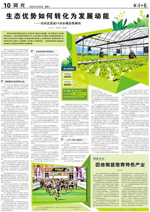 11月3日,《经济日报》整版刊登《生态优势如何转化为发展动能——对河北张家口市赤城县的调查》。张家口市赤城县立足森林覆盖率54.41%、林草覆盖率84.16%的生态本底,以“绿水青山就是金山银山”理念为引领,扎实推进生态优势向发展动能转化。该县通过打造百里露地蔬菜产业带、万亩设施蔬菜产业带,培育“赤城架豆”等特色品牌,推动农业提质增效;果断推进矿山绿色转型,发展种养循环生态农业,实现经济发展与生态保护双赢;依托优质水资源构建“水+N”产业集群,建设水科技产业园;利用气候凉爽、地形多样优势,成功举办多项国家级越野赛事,培育文旅康养新业态,打造海坨山谷、小西沟村等网红打卡地,形成“体育+文旅+康养”融合产业链。通过人居环境整治、和美乡村建设,赤城实现了生态保护、产业发展与民生改善的良性互动。