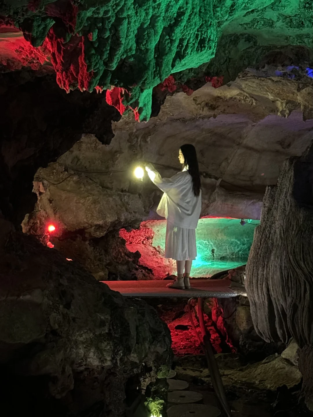 往里面走10分钟便能看到一个天然溶洞,洞内暖和,常年16度,坐在水边好惬意~