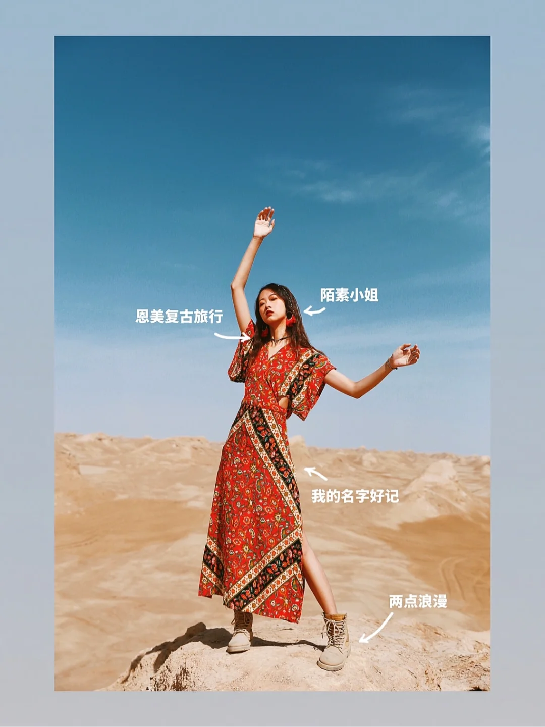 6⃣️鸣沙山月牙泉:亮色飘逸裙