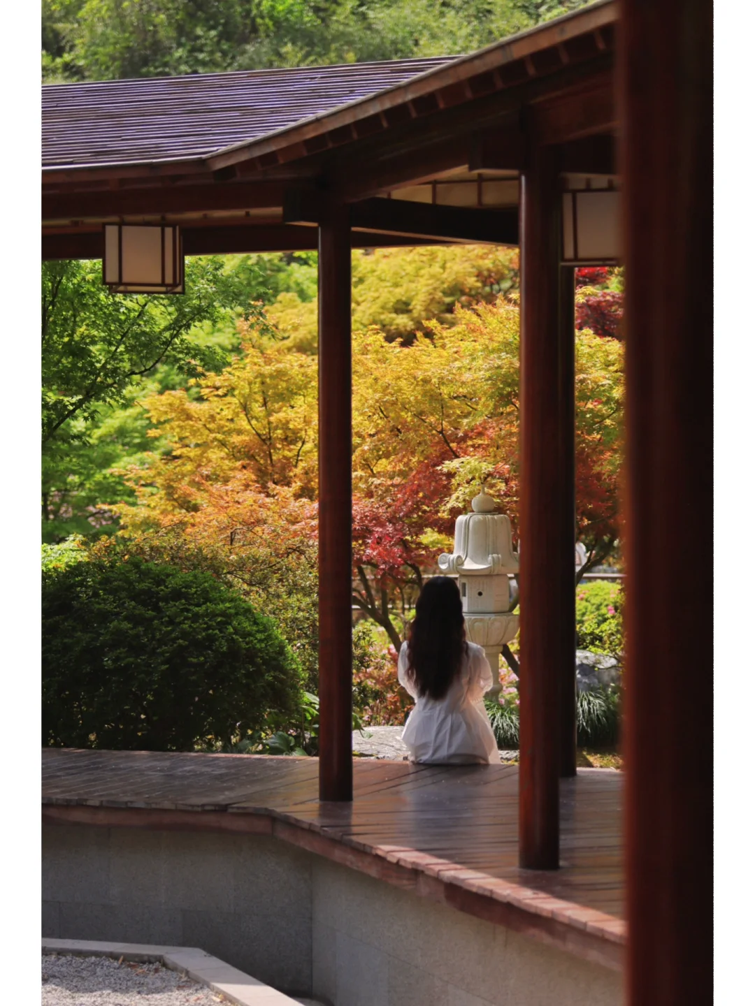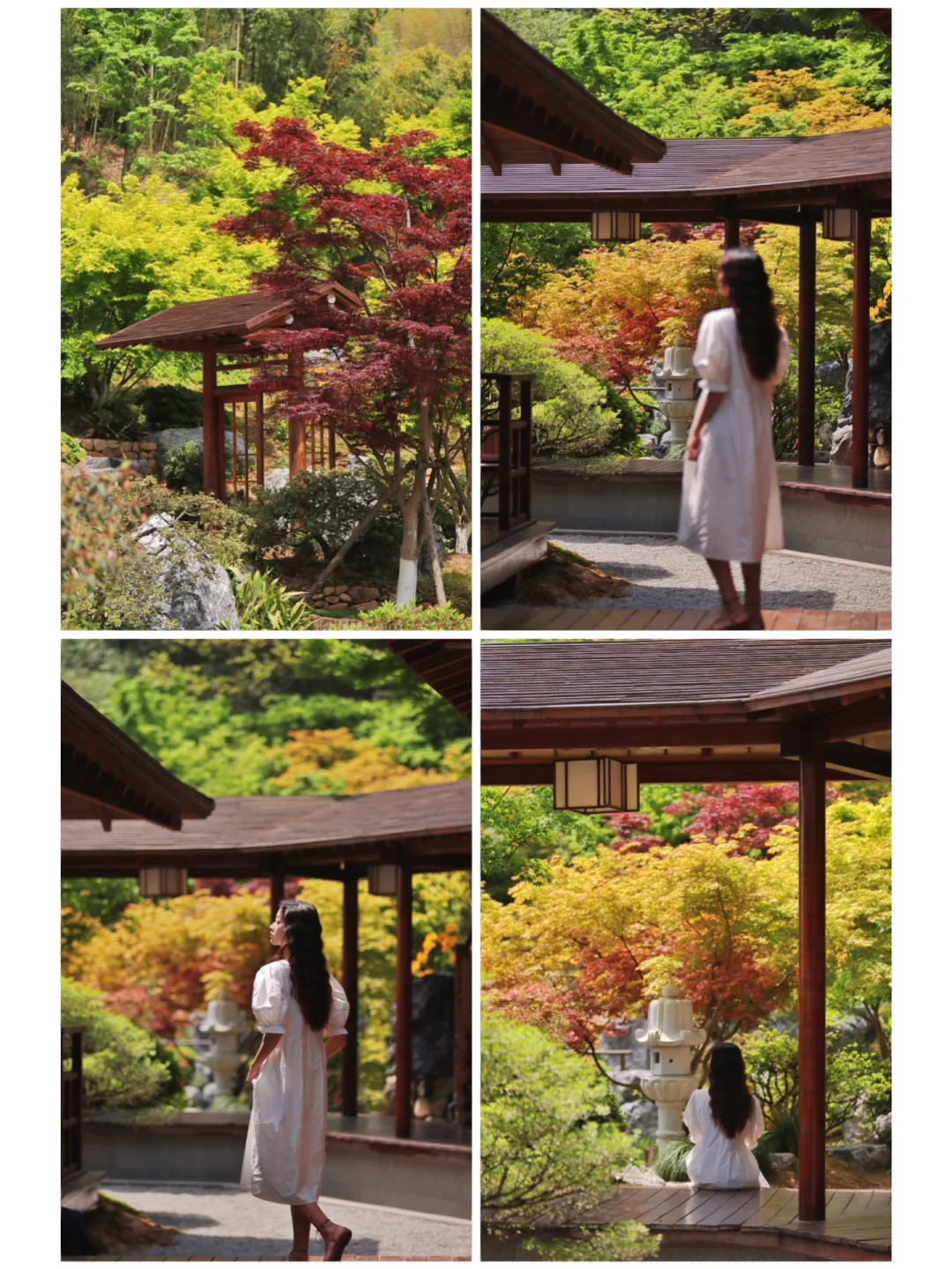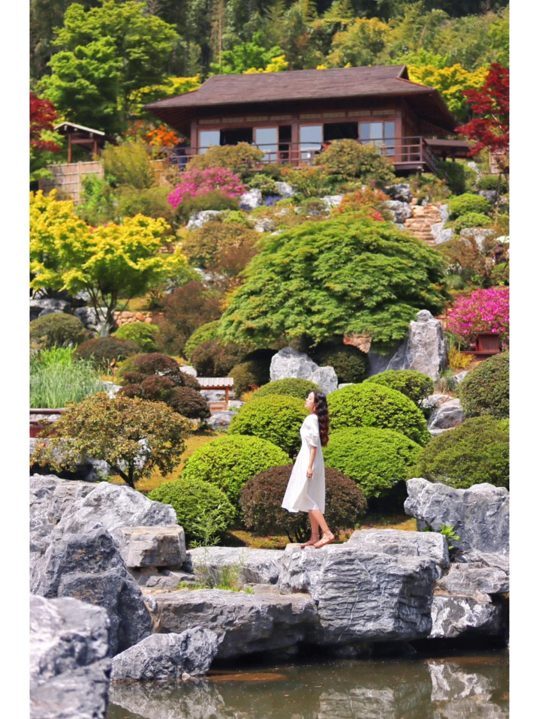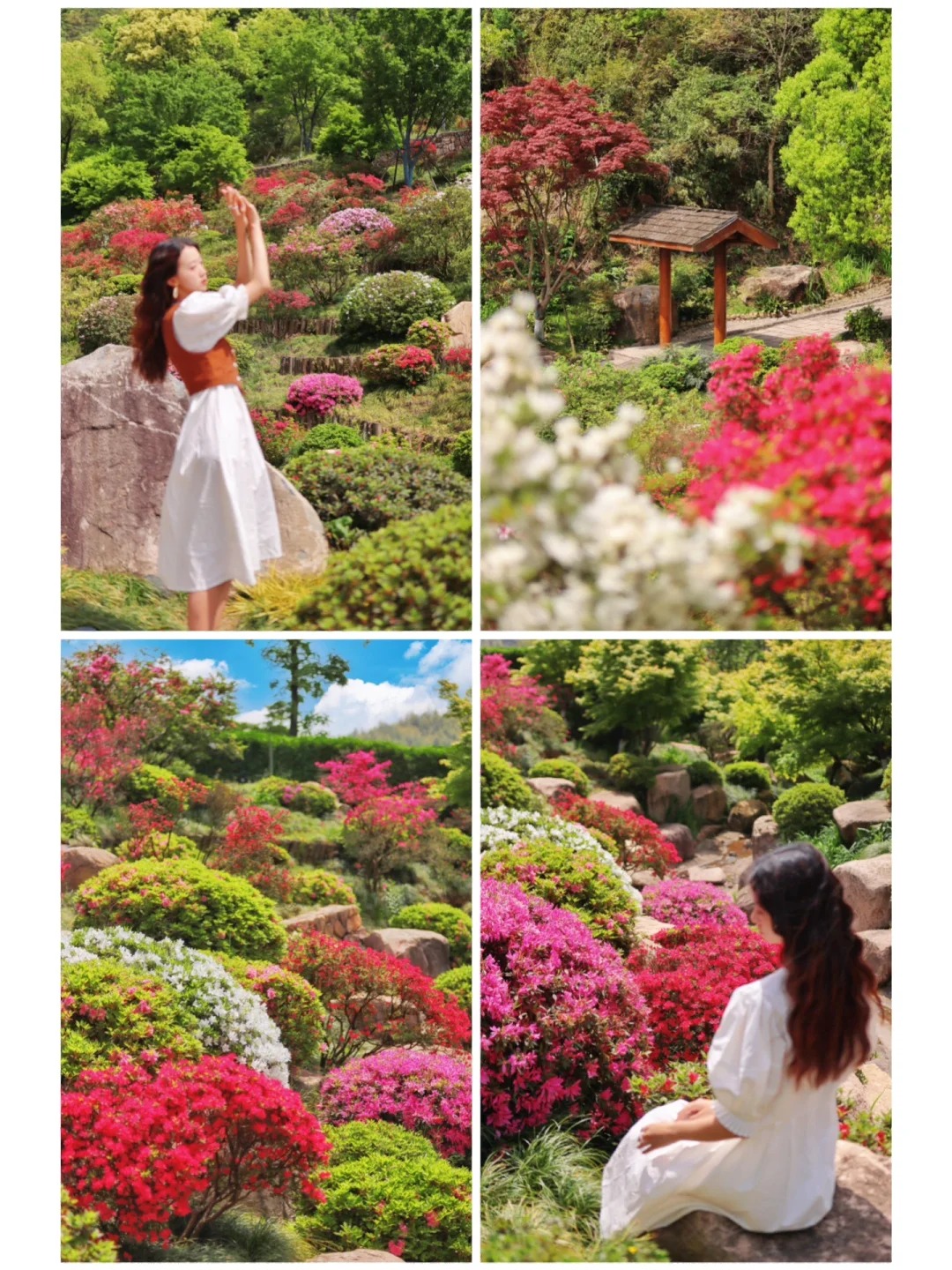 1⃣️杜鹃谷里成片的杜鹃争相开放,拾阶而上是假山怪石,里面的日式小屋配上红枫像极了到了京都!
