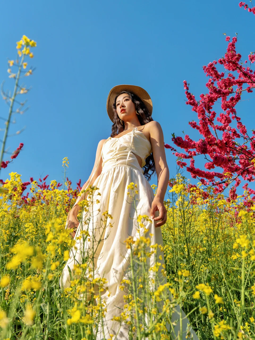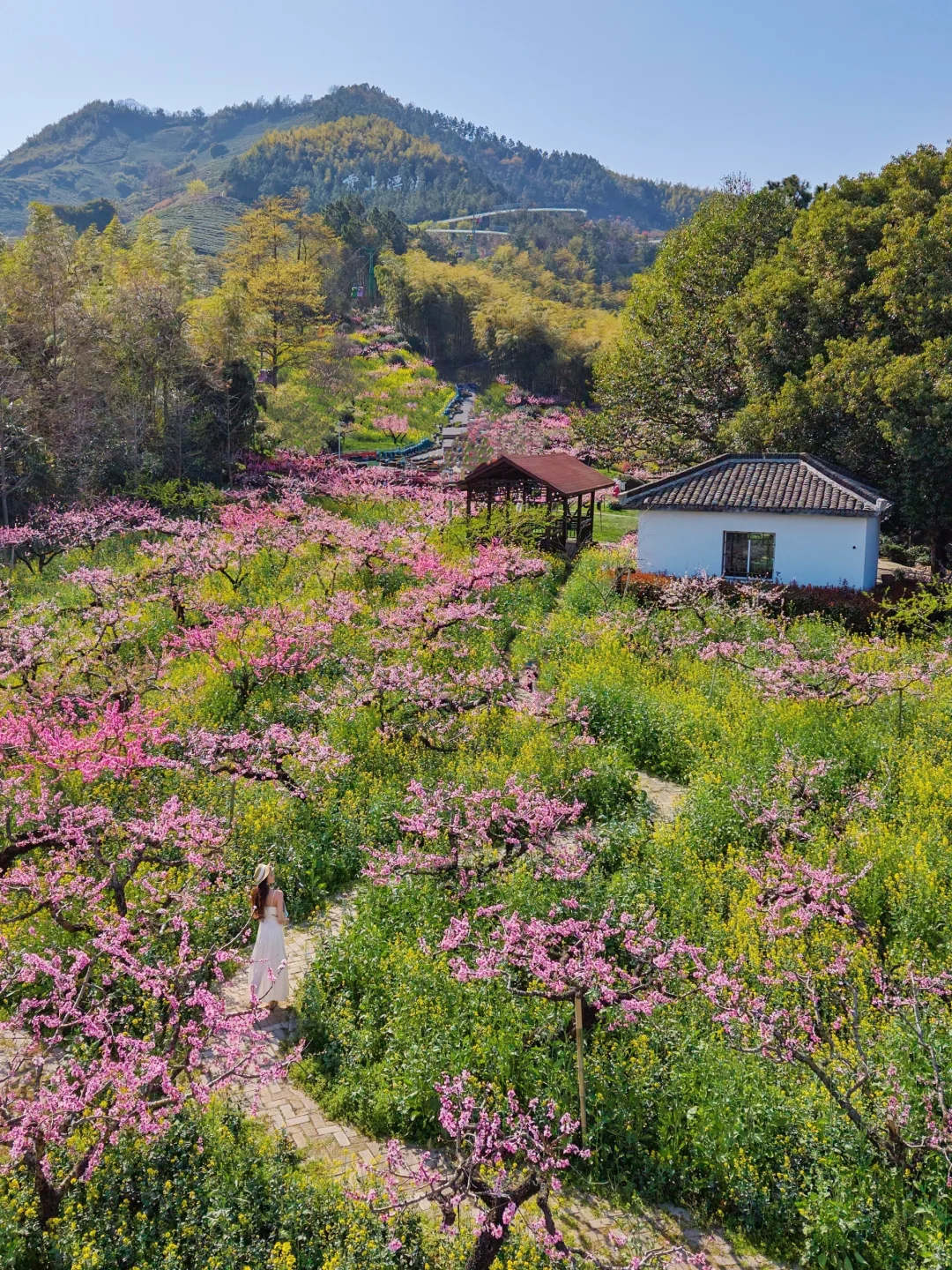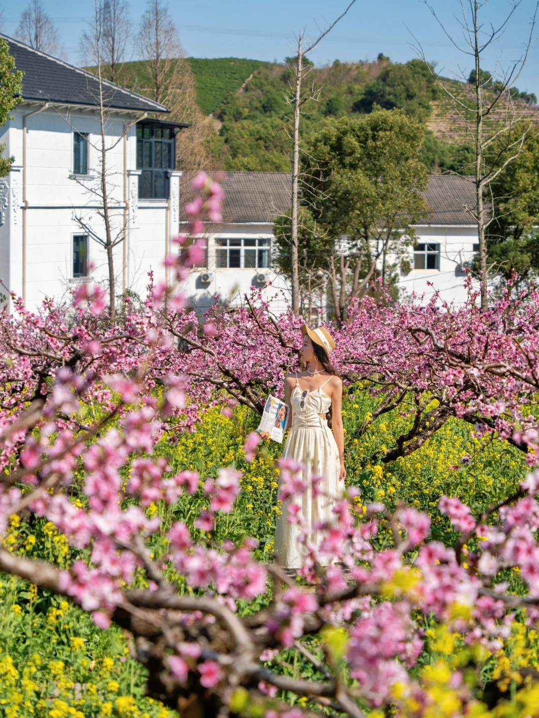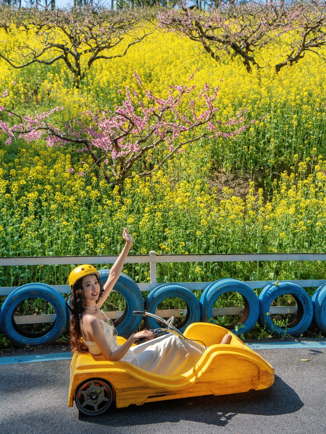 左右两边是灿烂金黄的油菜花海和如梦幻般飘落的桃花雨,仿佛闯进了宫崎骏的动画世界