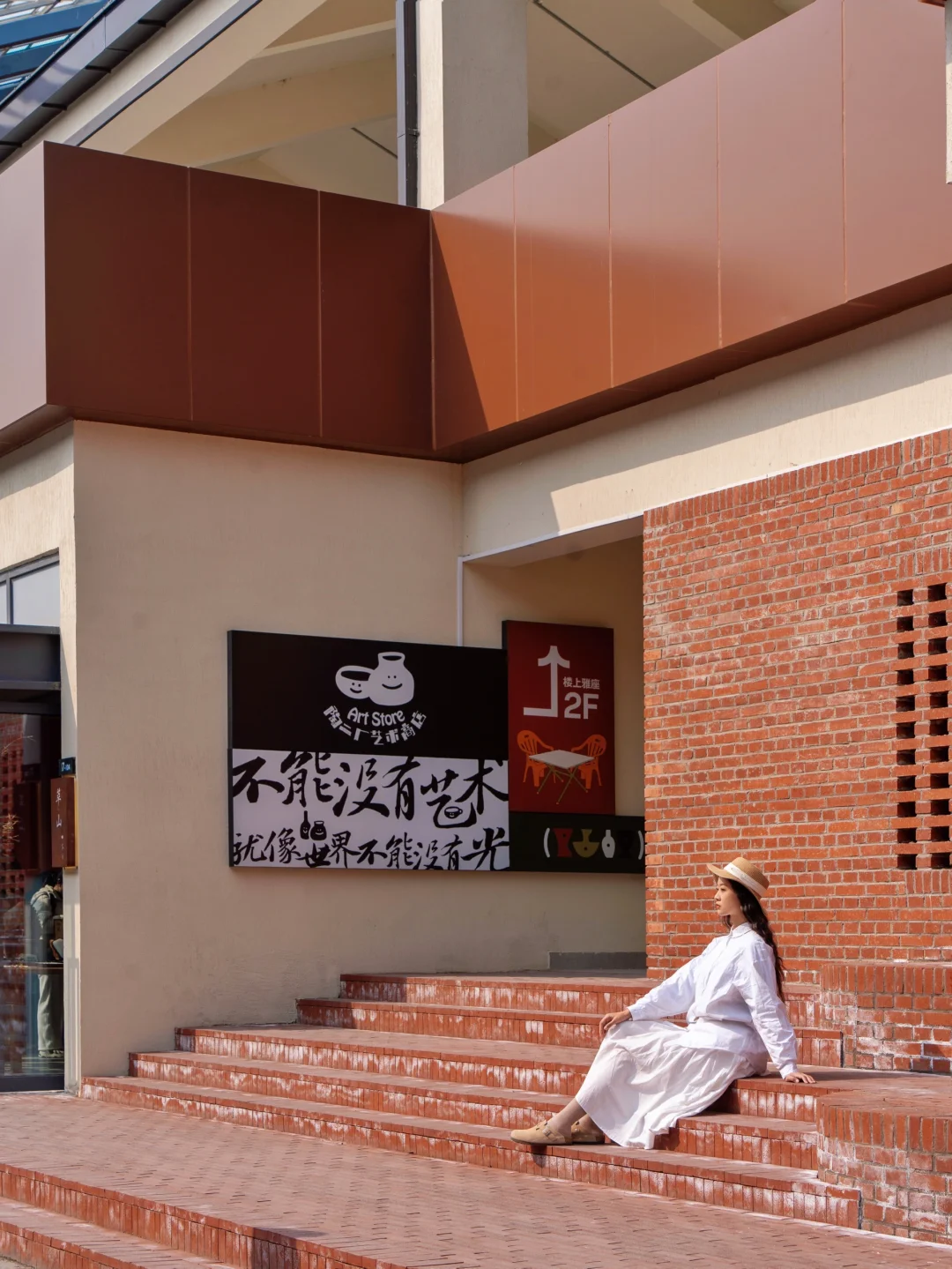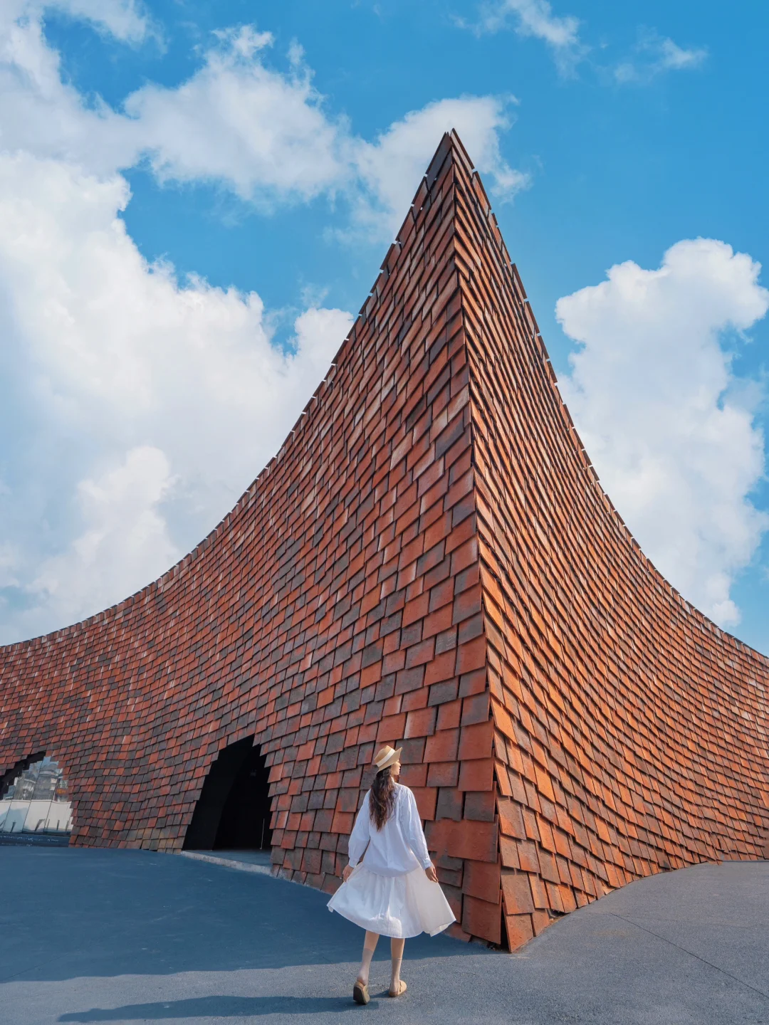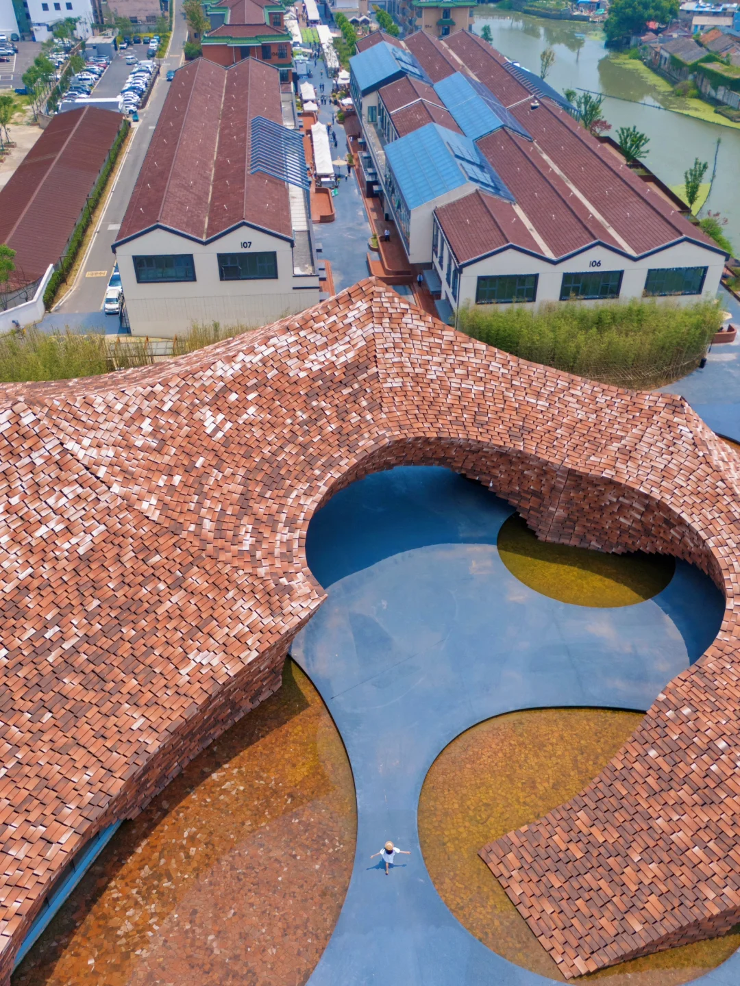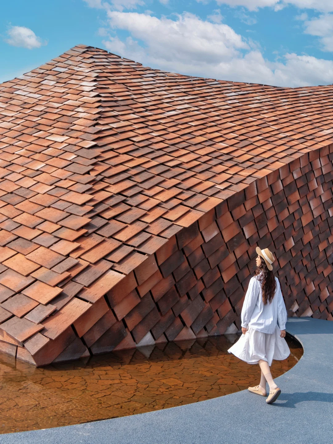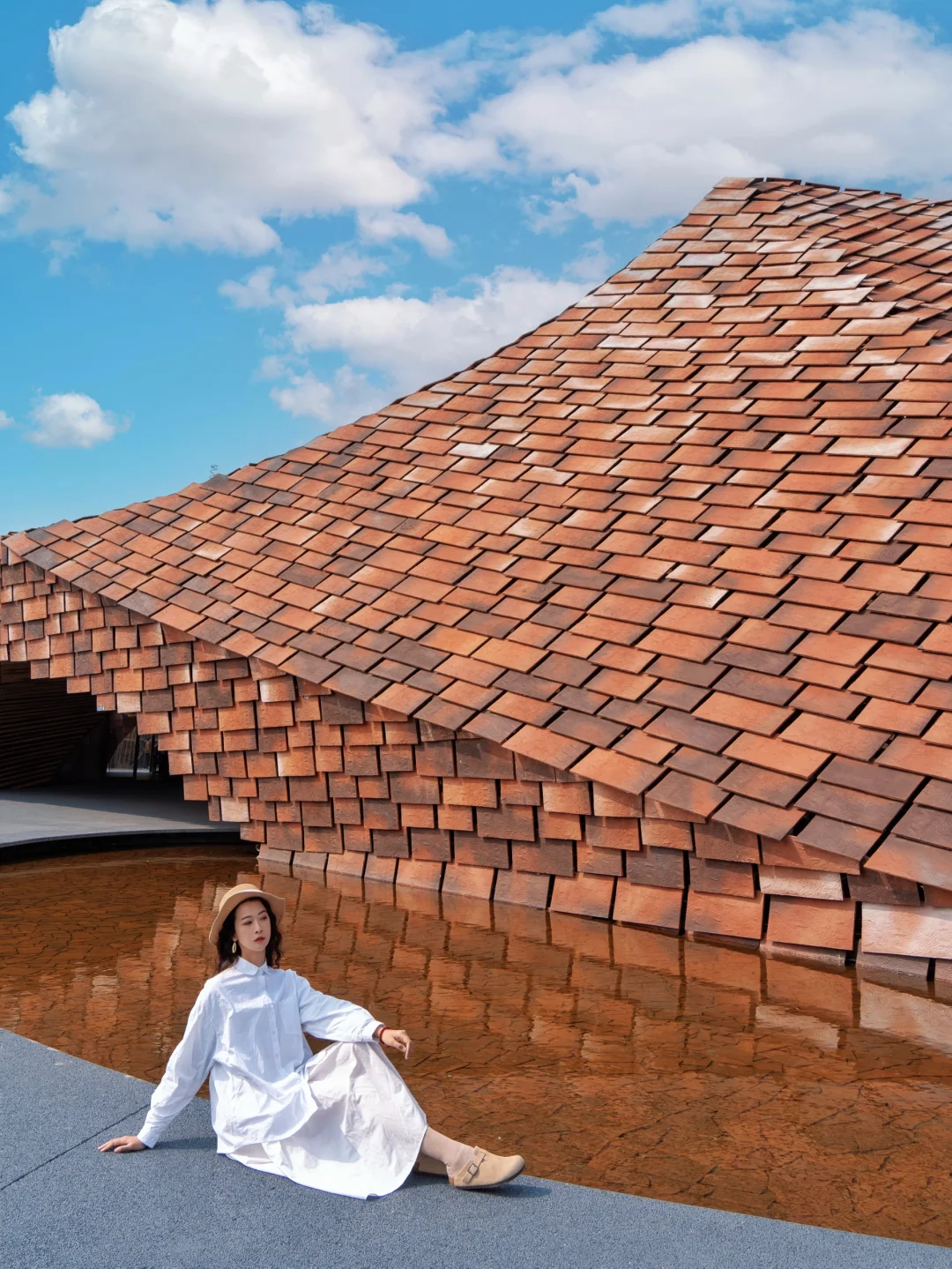红色陶片景观水池和外墙,运用了陶瓷艺术和传统建筑相融合的手法,也同时有飞檐翘角,拍照好好看!!