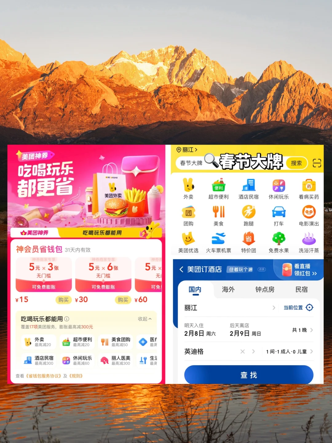 2⃣丽江住宿我是住在洲际旗下的英迪格,有自己的停车场,就在丽江古城,院落式的独栋小院,坐在院子里晒晒太阳好舒服,我是在美团搜春节大牌,2.9抵了30,真是神券一单就回本了!还有机会得膨胀免🆓单!!在丽江吃吃喝喝也能用2.9抵30,真是不错!