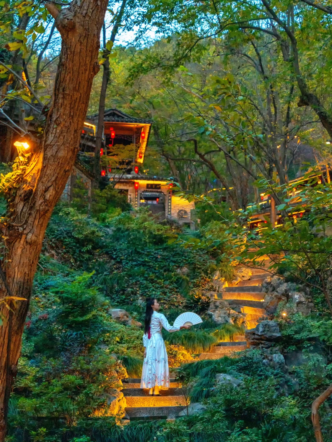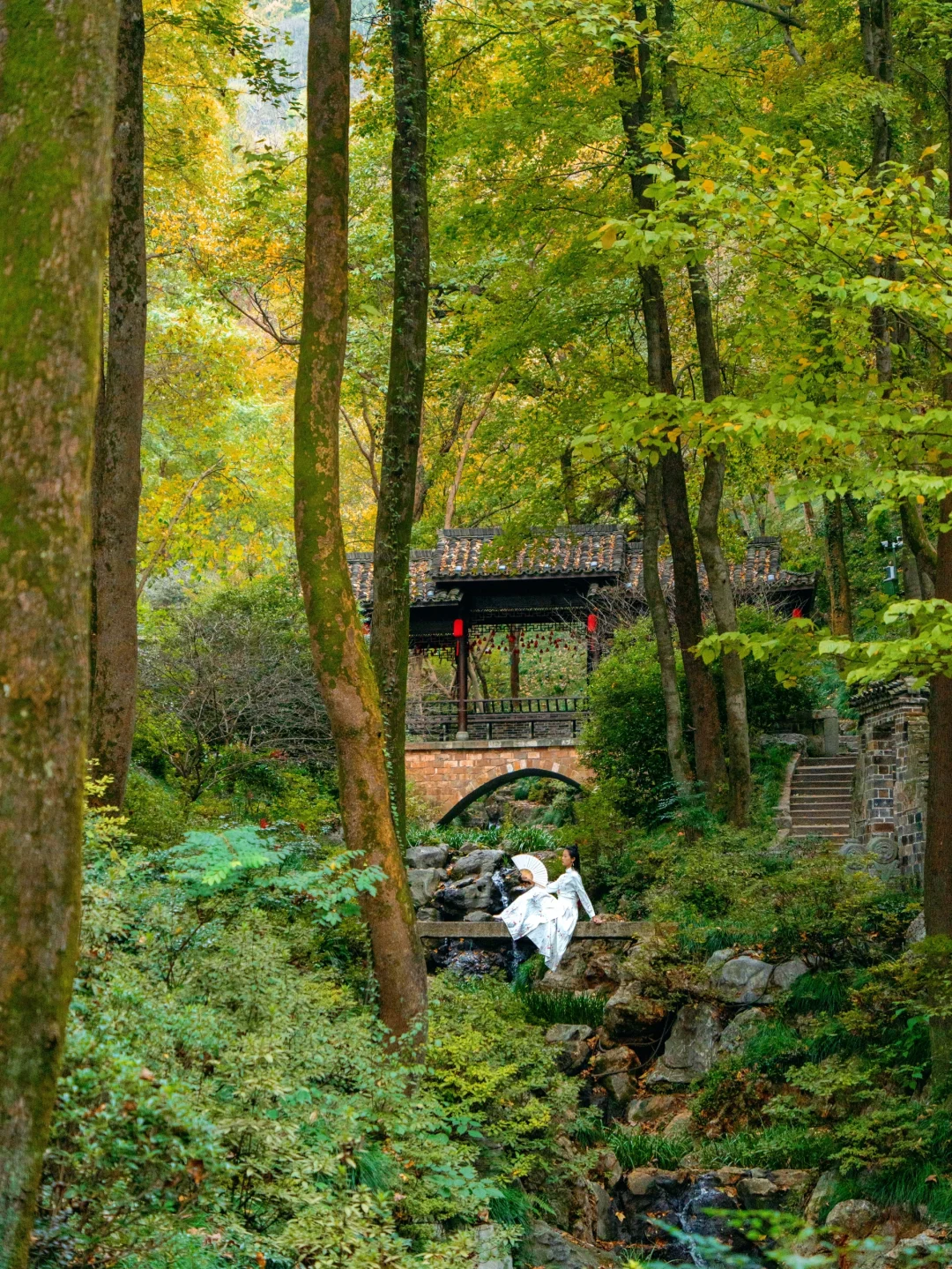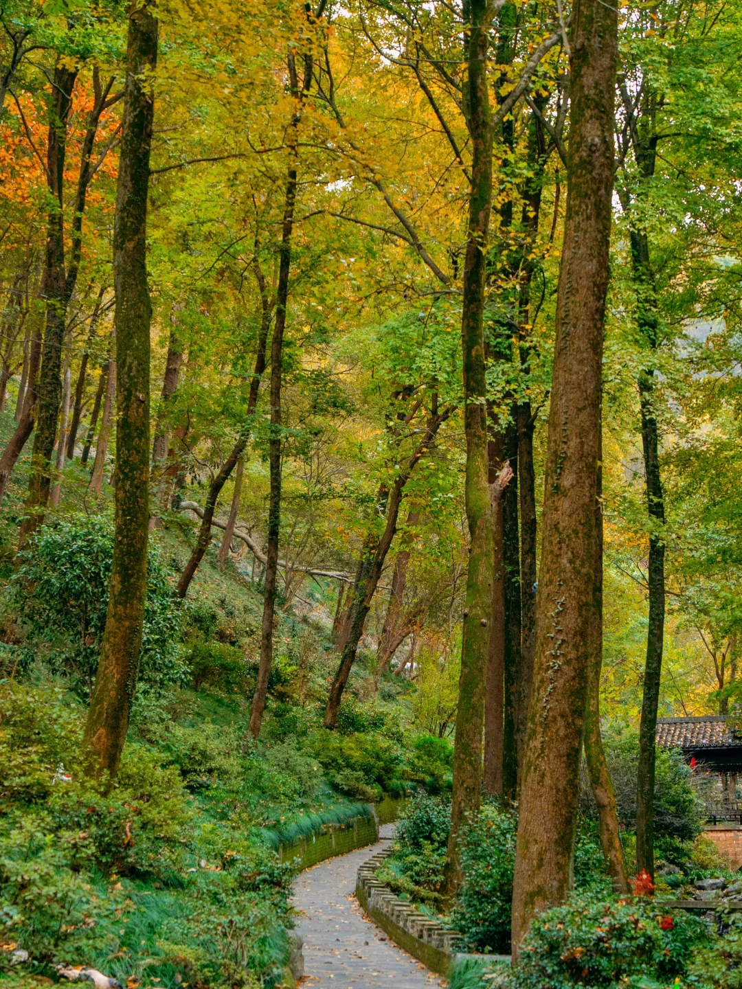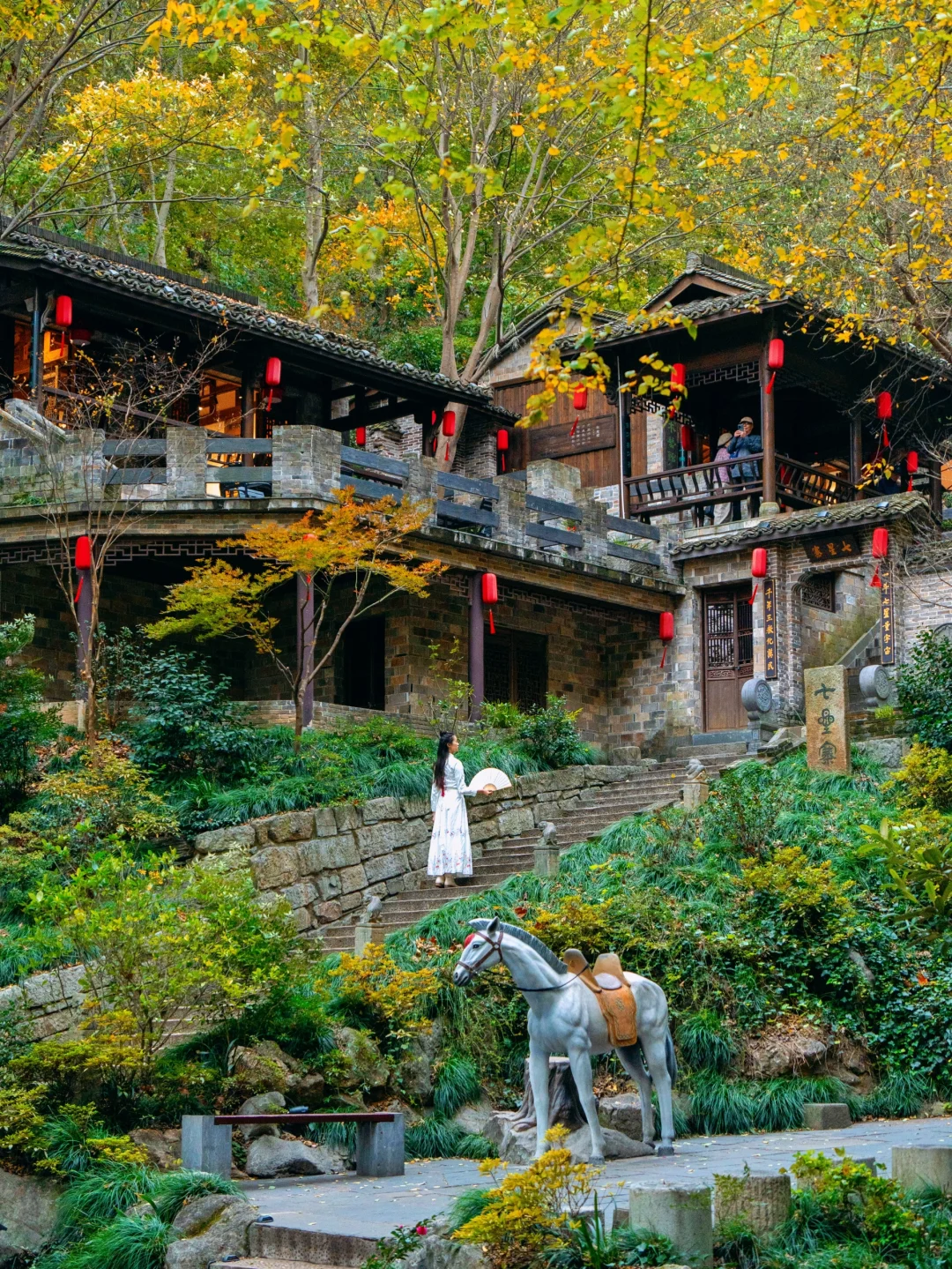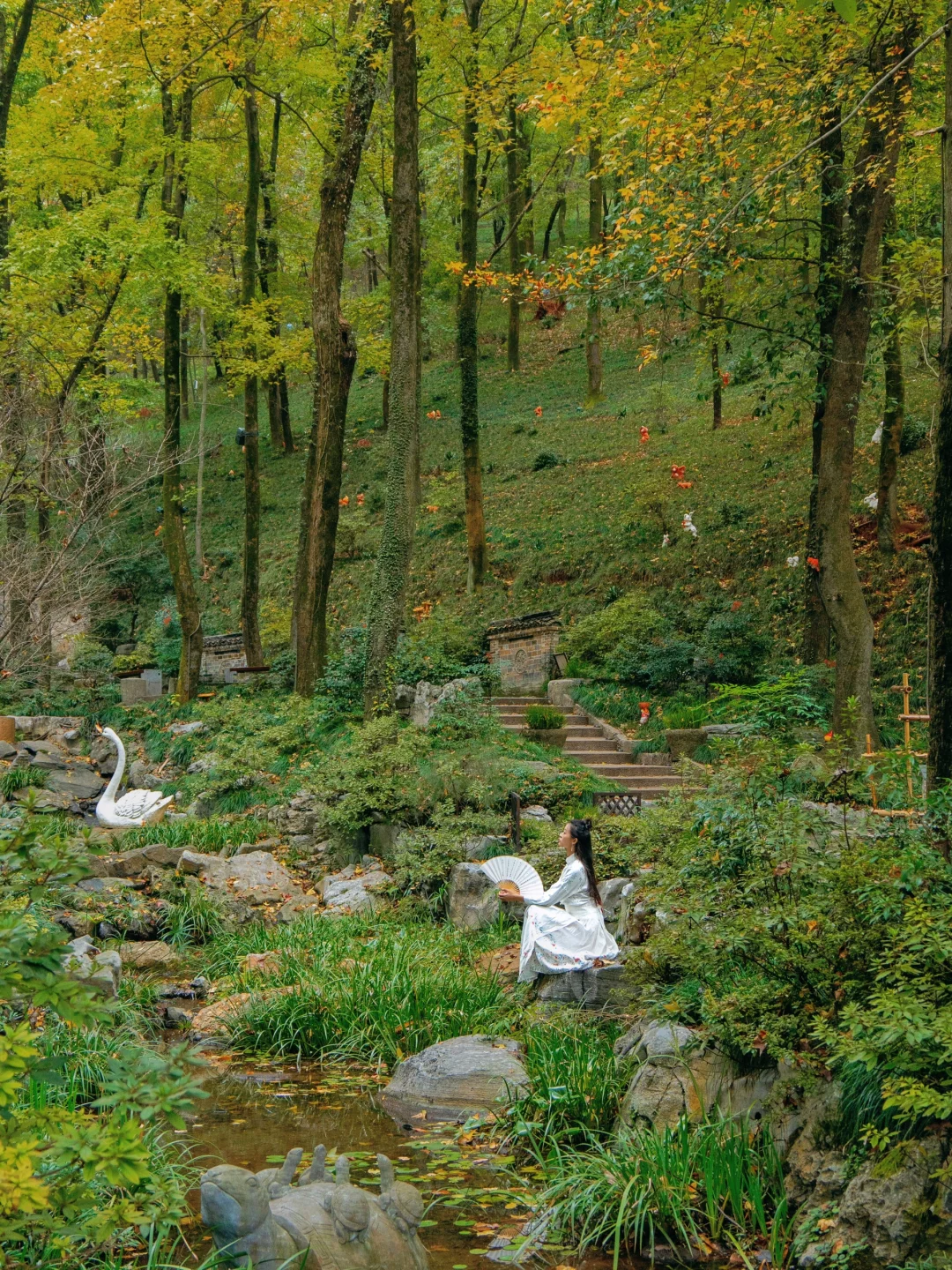 这里有着一片森林,满眼都是秋色,还有亮灯的江南古房和大白鹅,云梯往上,滑梯下来,无痛登山~