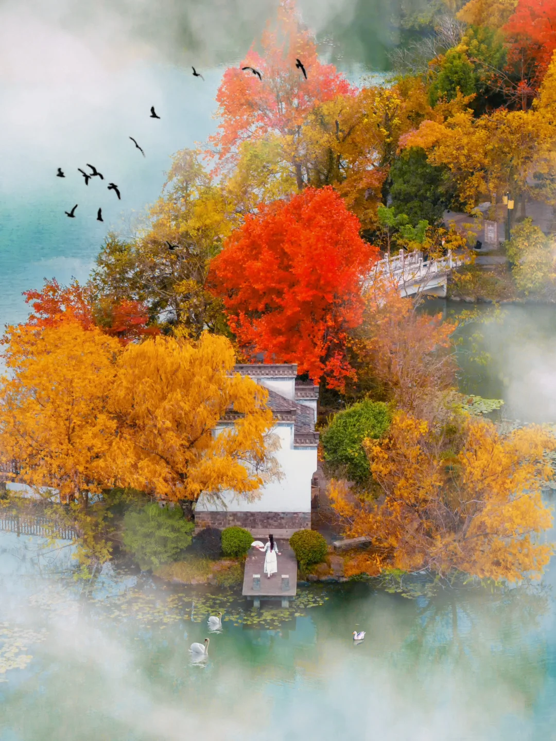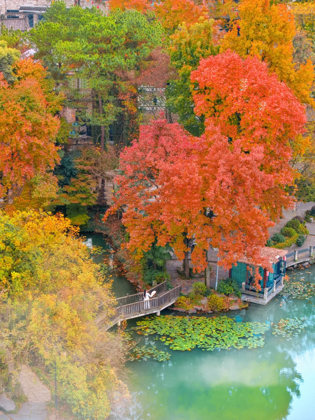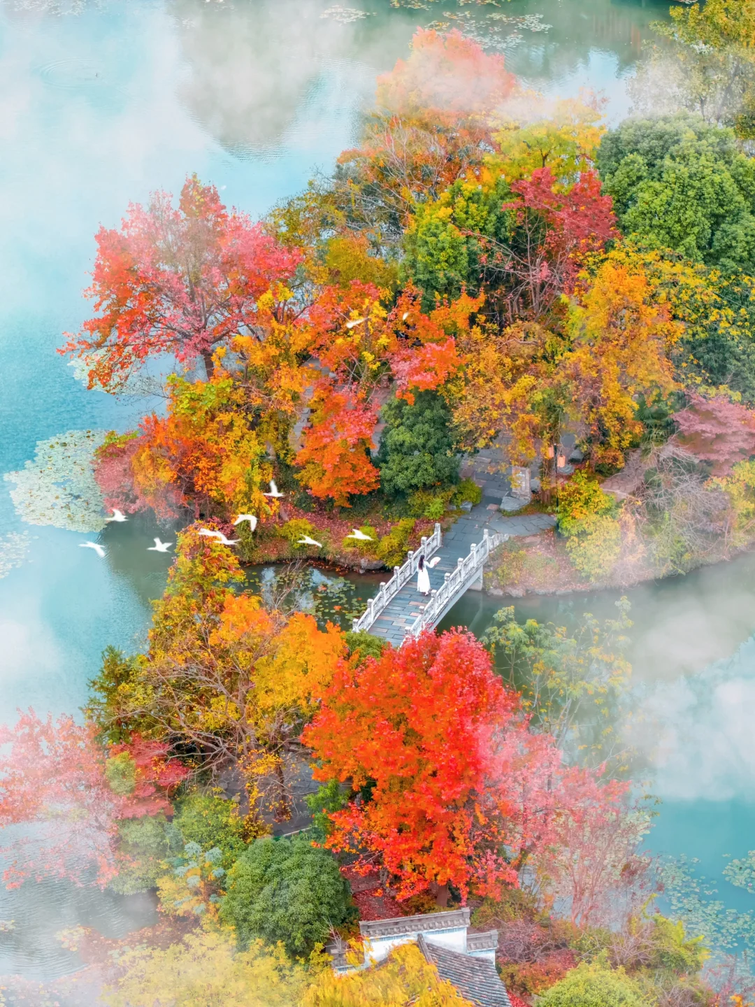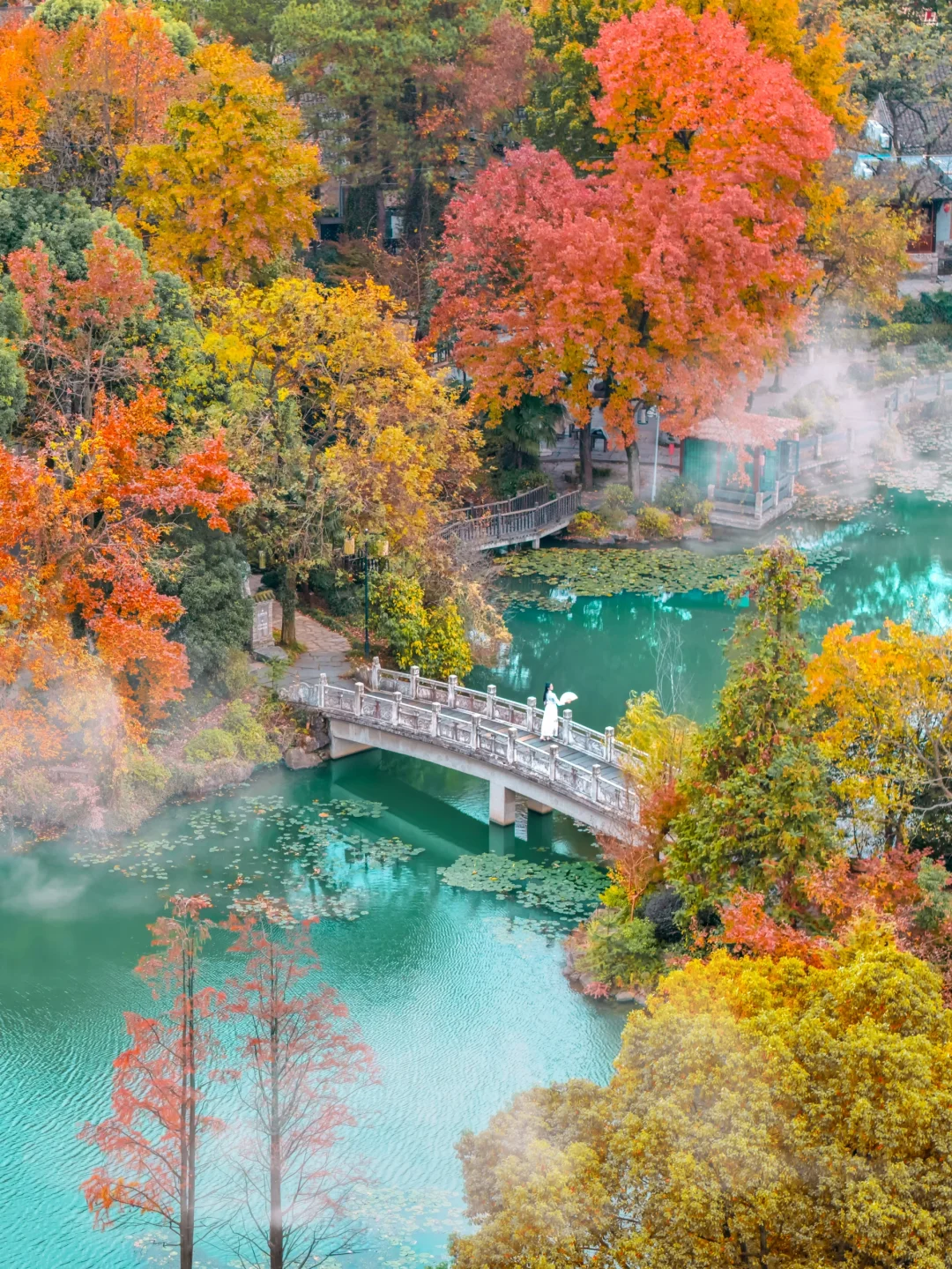 一汪湖水边到处都是五彩的树,秋天就是天然的调色盘,倒映在水里真的好美!!走在白玉桥上,赏赏秋景好惬意~