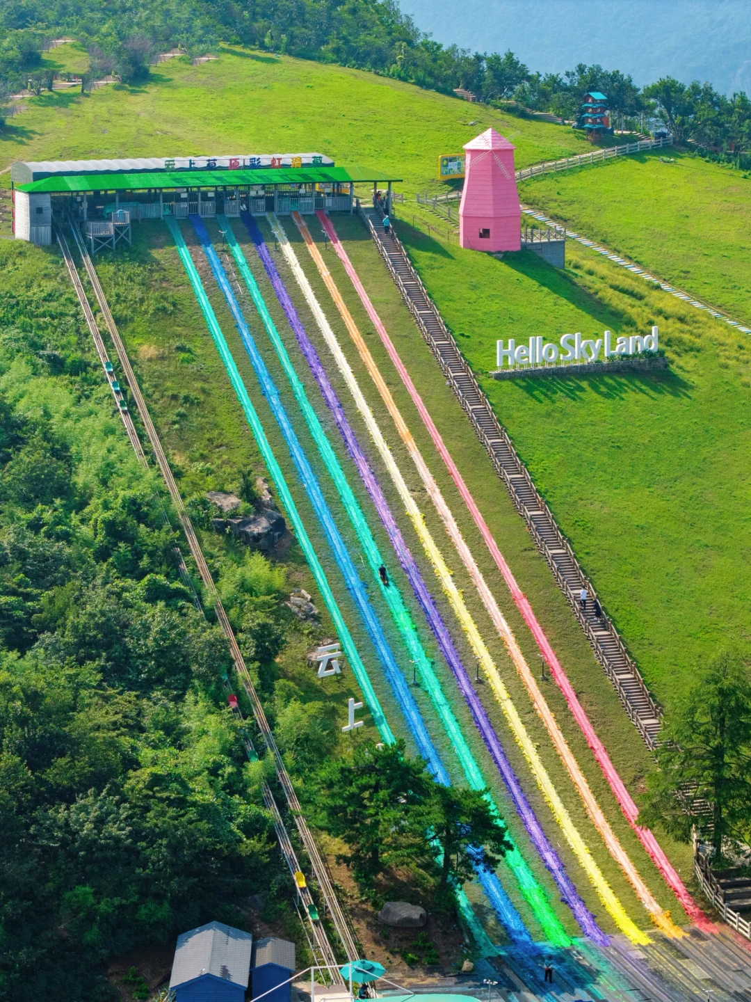 这里不定时会有小羊放出来,黄色的小花布满了整片草原,绿色的草原加上小羊像是到了呼伦贝尔,坐上滑草一路追风而下,享受风拂过脸颊