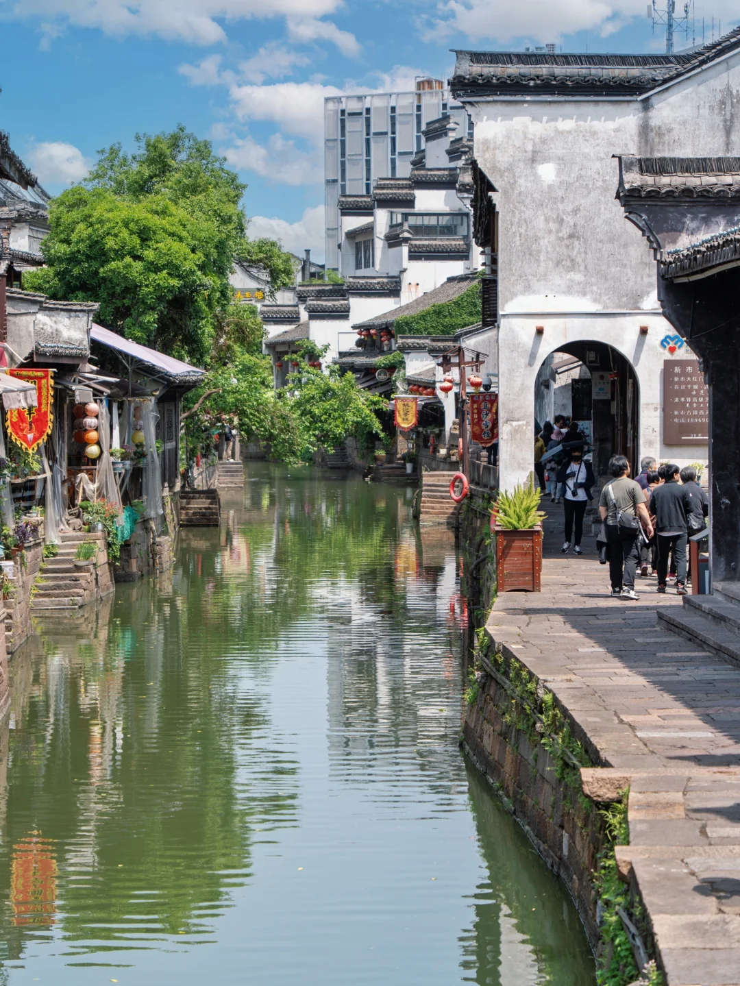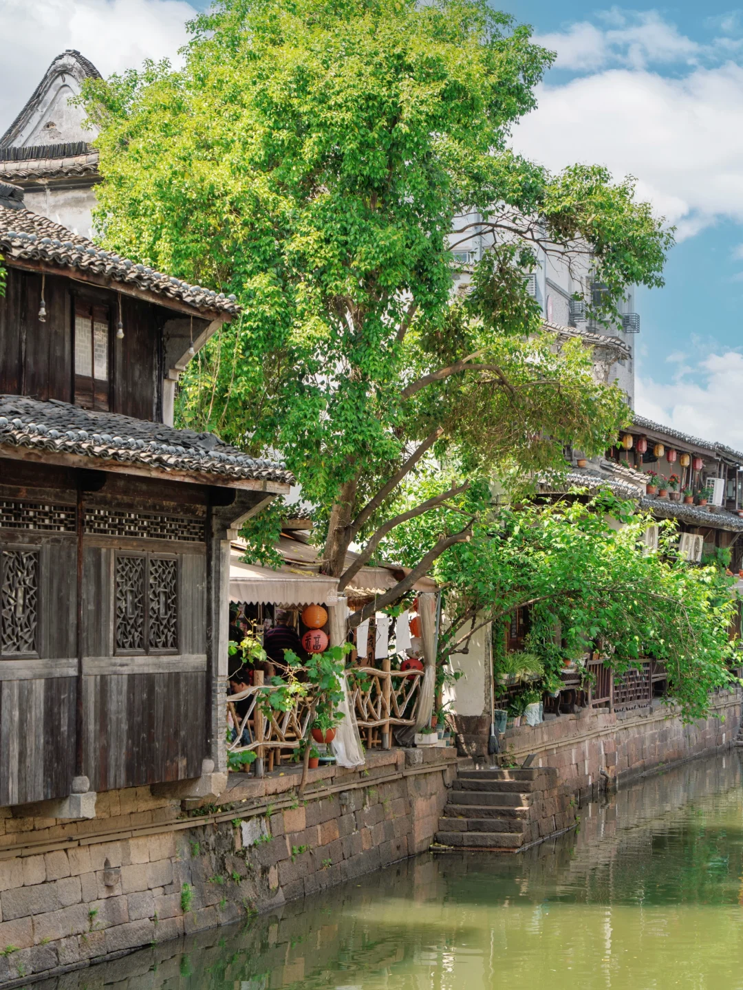 这里保留了好多明清时期的古建筑,临河而坐来一壶茶,悠闲自得~古镇口的大树、来往的乌篷船、丰富的美食,这大概就是新市古镇