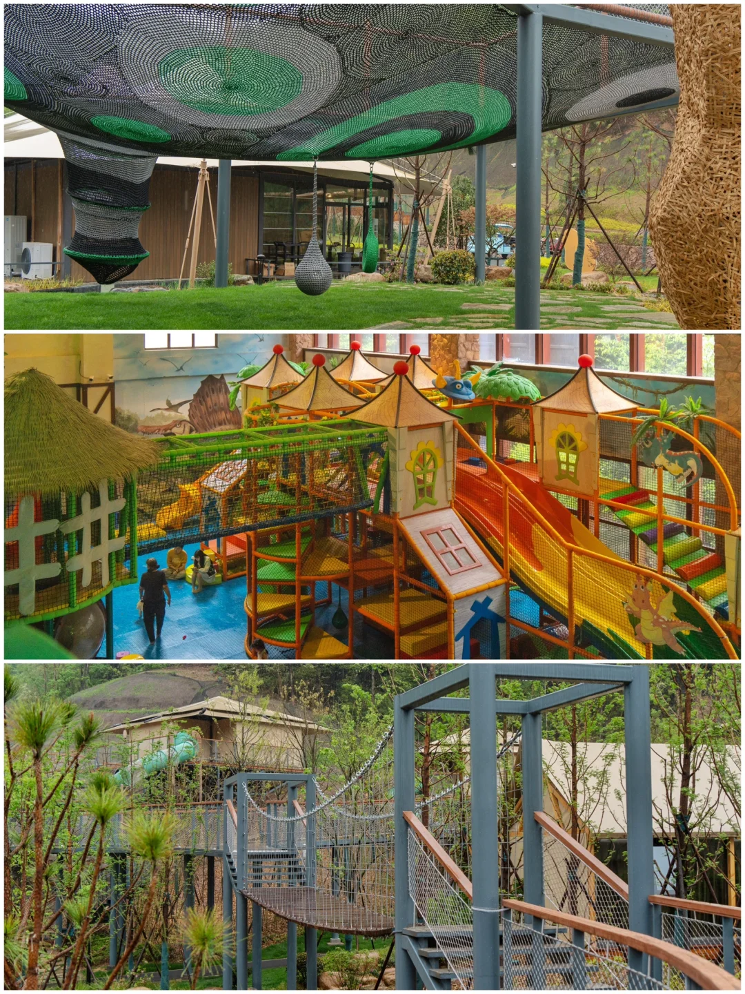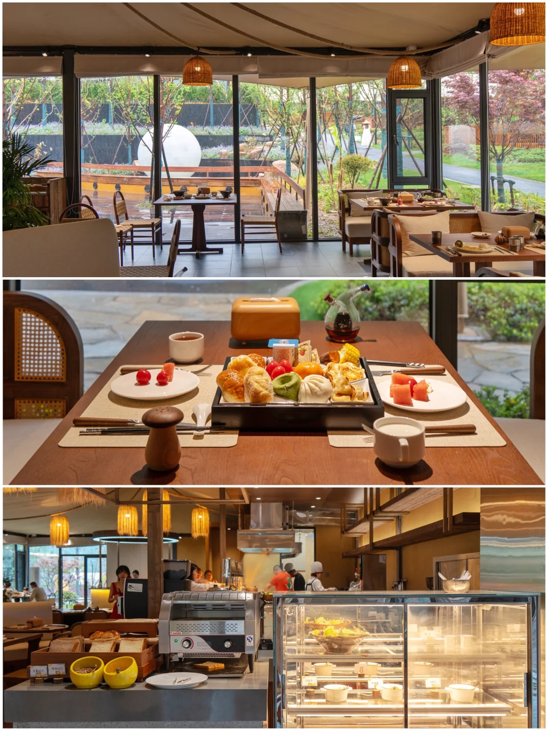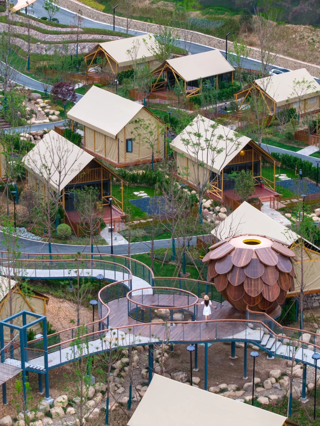 住在山间,帐篷样子的酒店空调卫生间都有,每一间都带一个小院子,坐着吹吹风也太舒服了!房间里mini bar、欢迎水果、复古音响都有~早餐很丰盛,中餐西餐都有,园区里的接驳车随叫随到~酒店是宠物友好的,可以带上自己的小宠物一起去山里度个假!