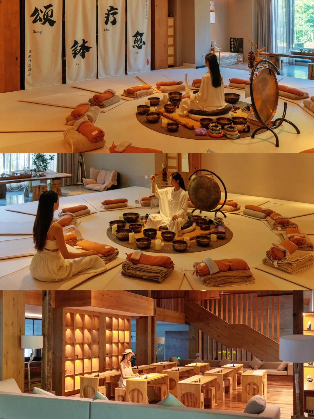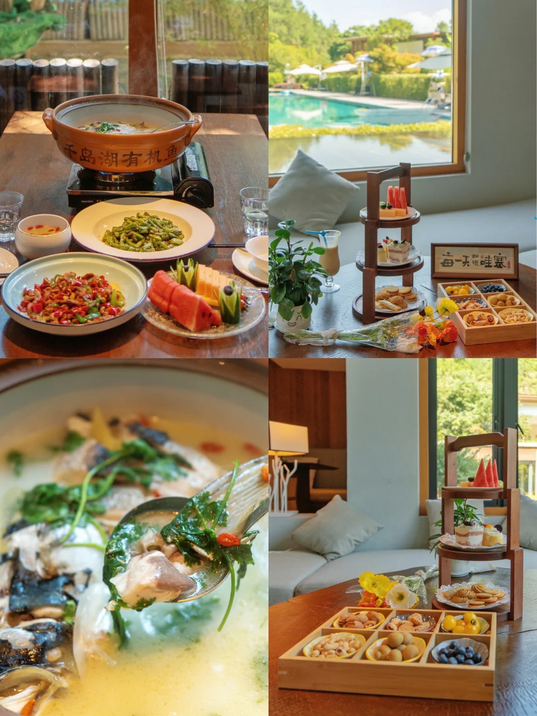 1️⃣千岛湖白天气温较高,可以找个带泳池的酒店,然后傍晚时分再出发去千岛湖,开始夜游,我住了千岛湖原岛秘境酒店,距离天屿山、千岛湖夜游、月光之恋、理想花园都不远,而且有一个大泳池,从房间里就可以直接通往泳池,也有直接面朝千岛湖的房间,到了的中午可以在餐厅来一份千岛湖特色的鱼头,味道好鲜美~D2早上起来还能跟着颂钵和易筋经老师体验一下放松的课程,扫清前一天的疲惫感~