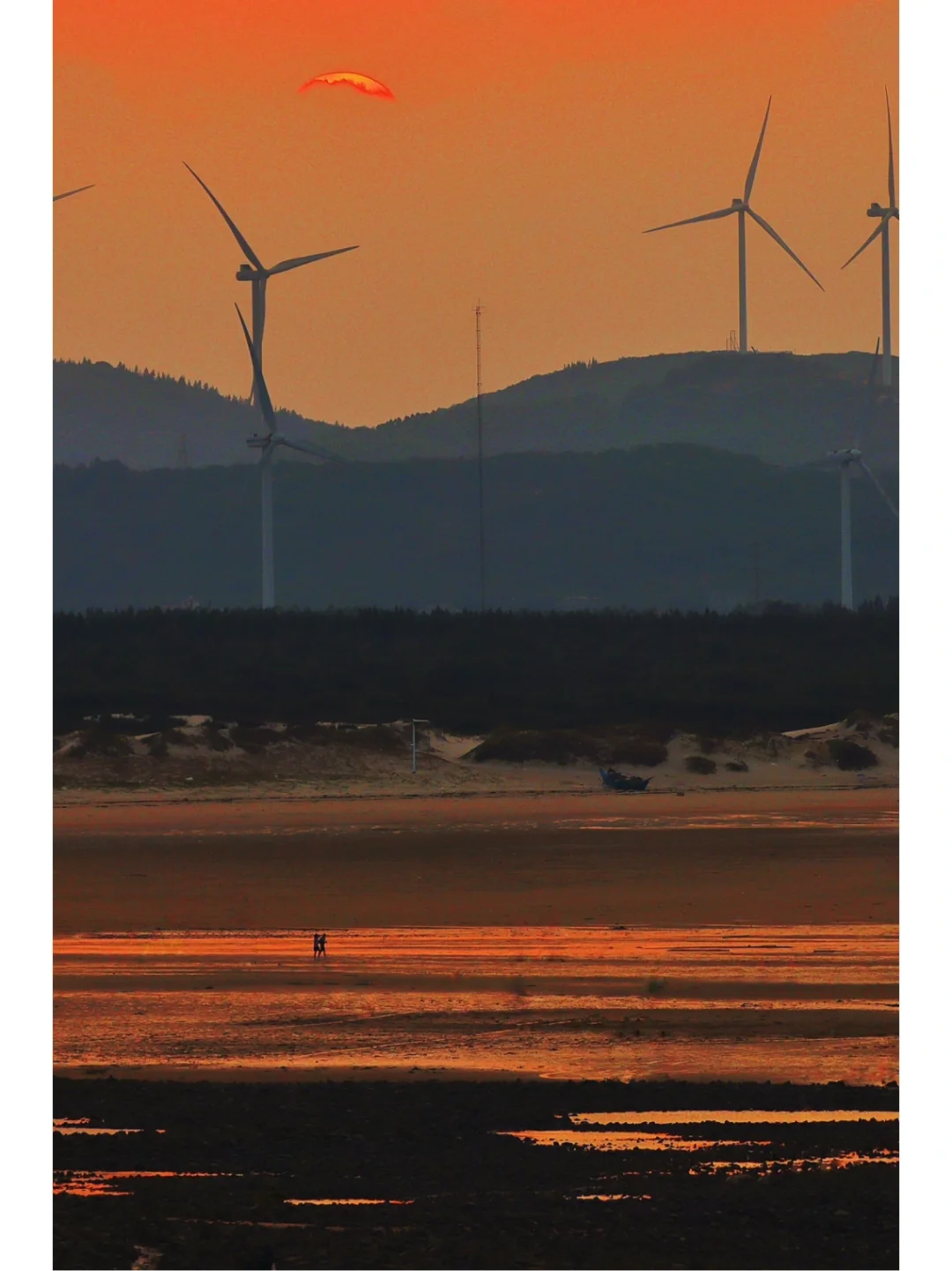 长江澳日落不是在海面,是落在风车田里,站在沙滩边拍,沿着路往南走100米有缺口,在高处看日落更好看