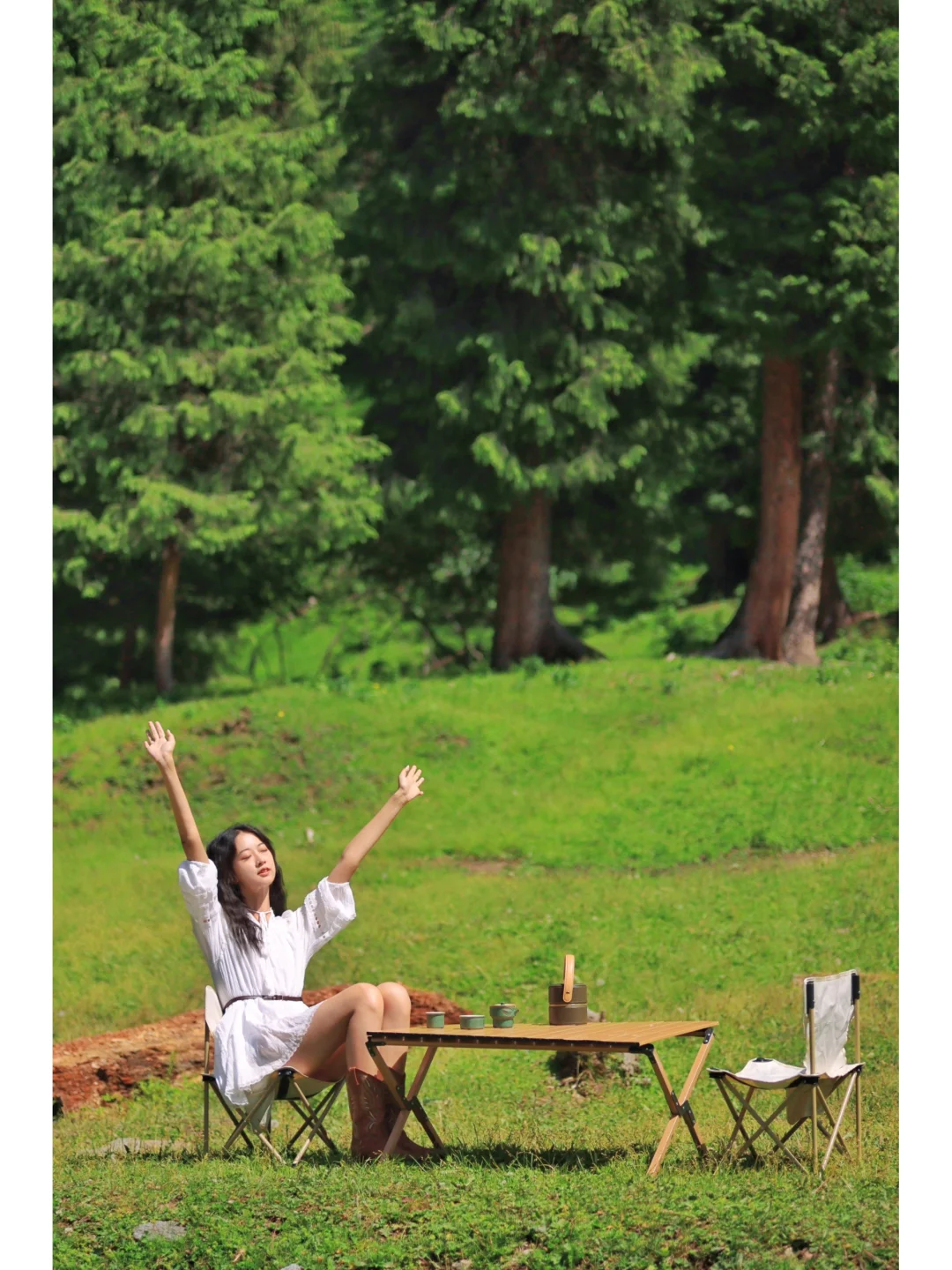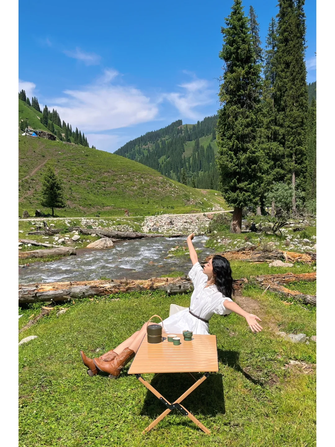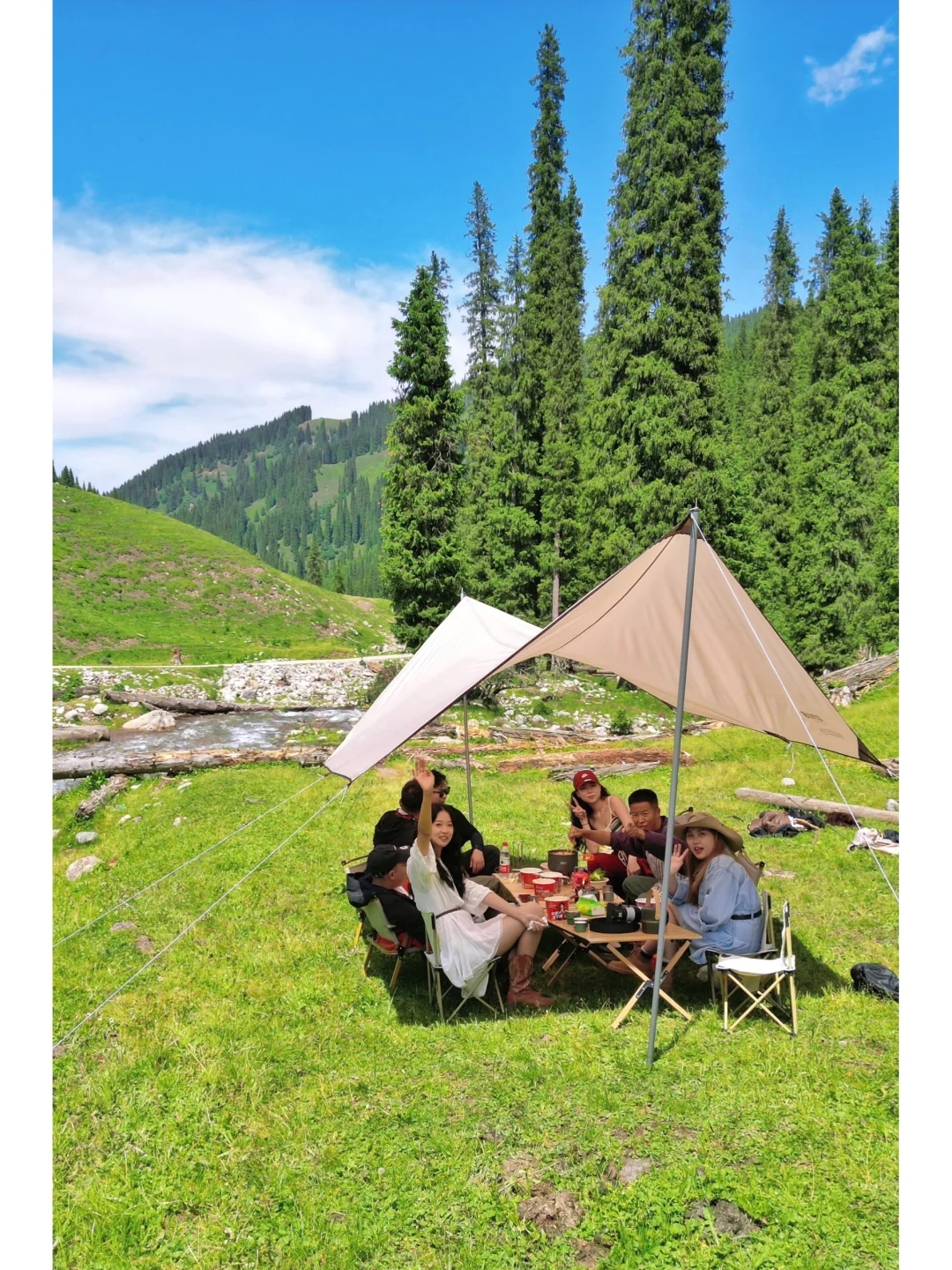 ⛺️这里还能露营,搭上天幕面朝着恰西森林坐着,来一杯茶真的是太舒服了!!我带的三星堆快客杯一直被路过的阿姨们夸好看,变成了流动拍照点,收纳起来放进包包里很小~我们出发前在镇上买了好多蔬菜、牛肉和面食,坐在这河流边上吃个面也太舒服了!(一定记得无痕露营!