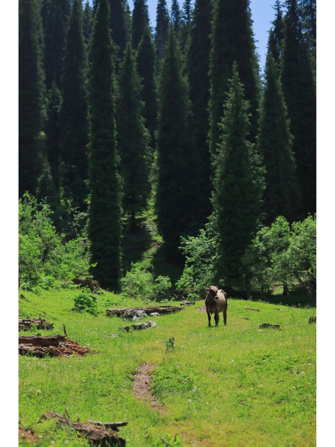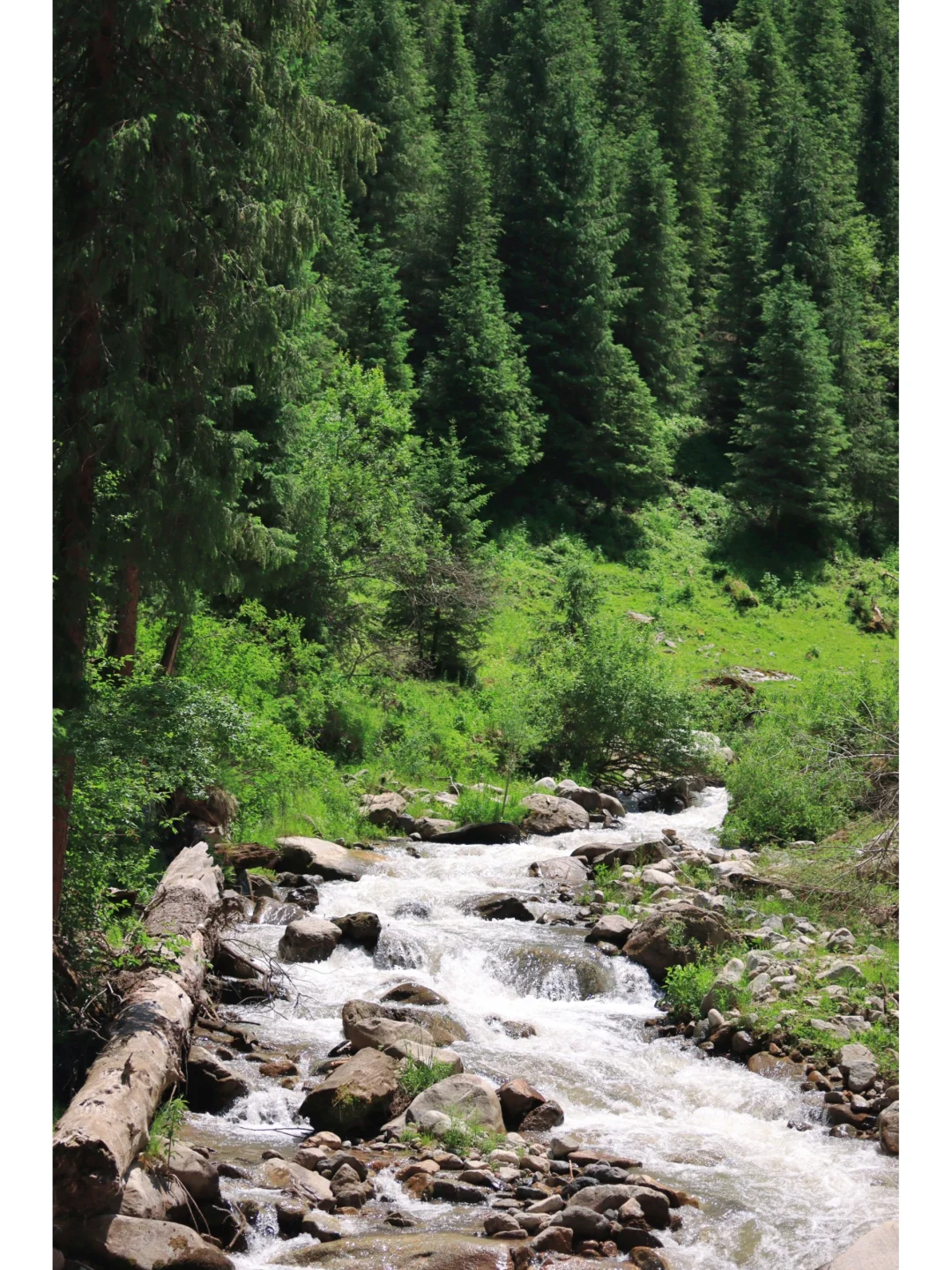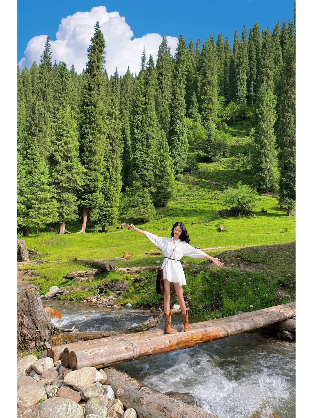 从恰西画卷继续往前大概5.2公里的左边,能看到一条河流从上而下,有一座独木桥在河上,背后是森林,真的太美了!过了桥往里走还有很多牛和羊在草坡上吃草~