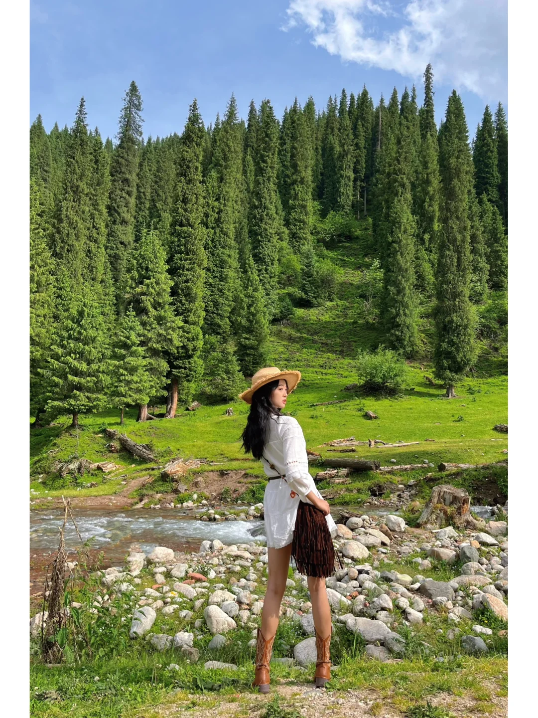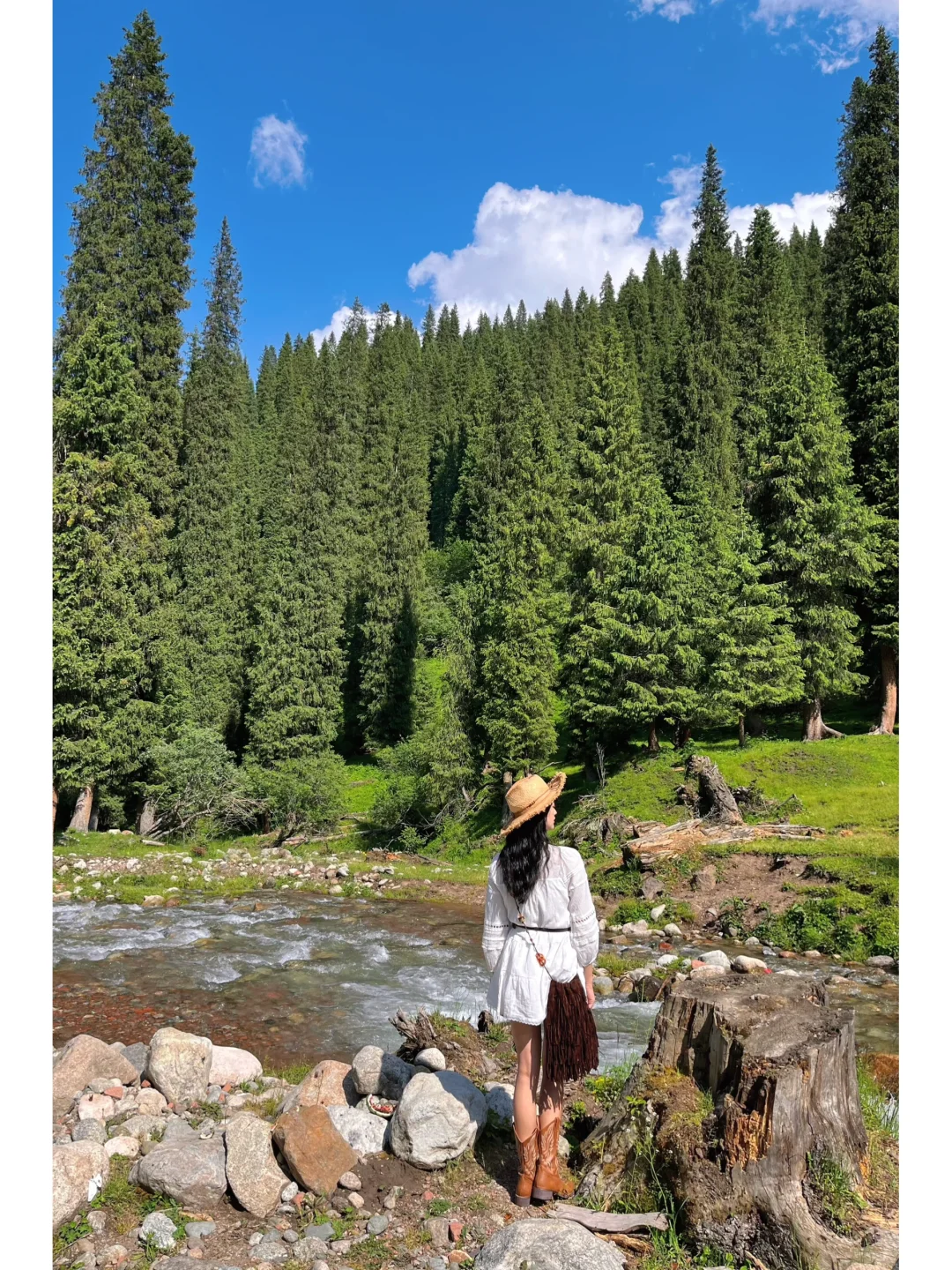 2⃣️站在河边木桩旁,背景是满眼森林