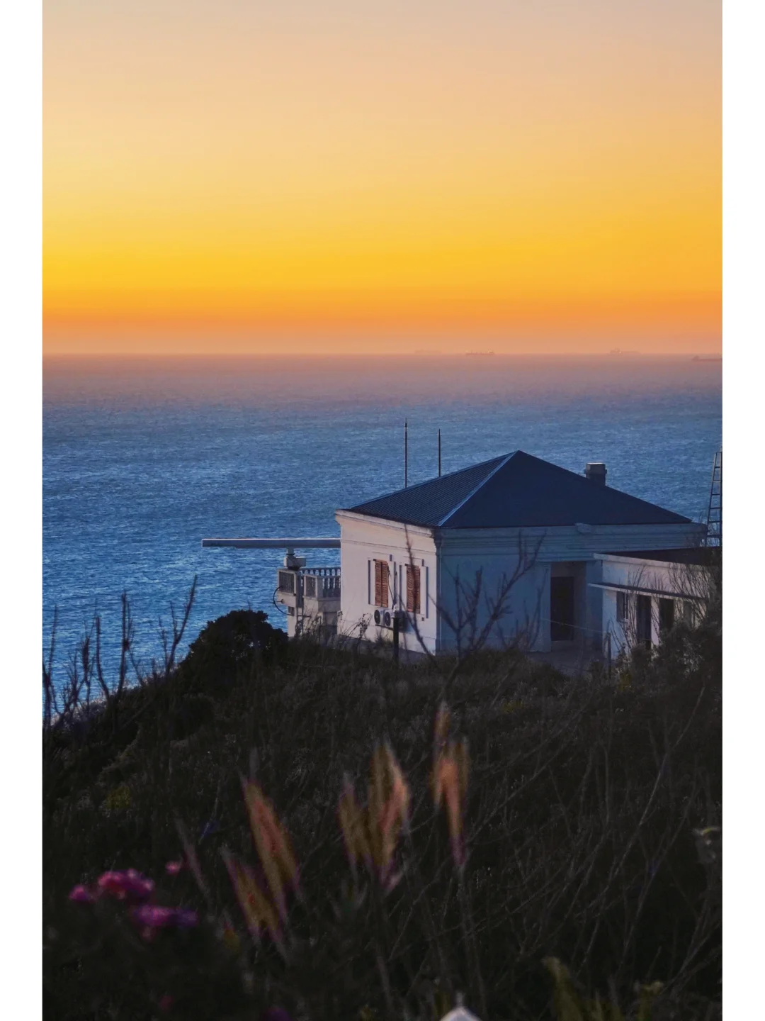 灯塔下有一个小村子,是海边小渔村的感觉,看着太阳慢慢落入海里,海上泛起浪漫的余晖,大朵的云变成了橘色~