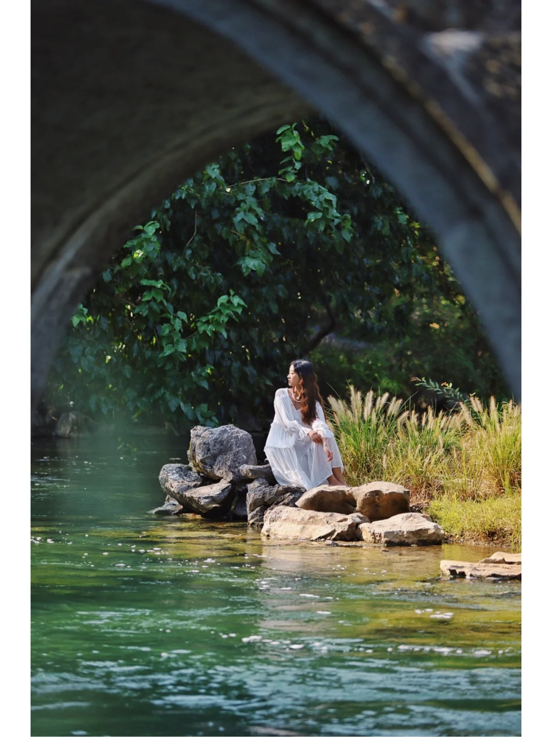 2⃣️导航珠帘壁,透过门洞拍,把水流放在下面一点,人坐在石头上(P5
