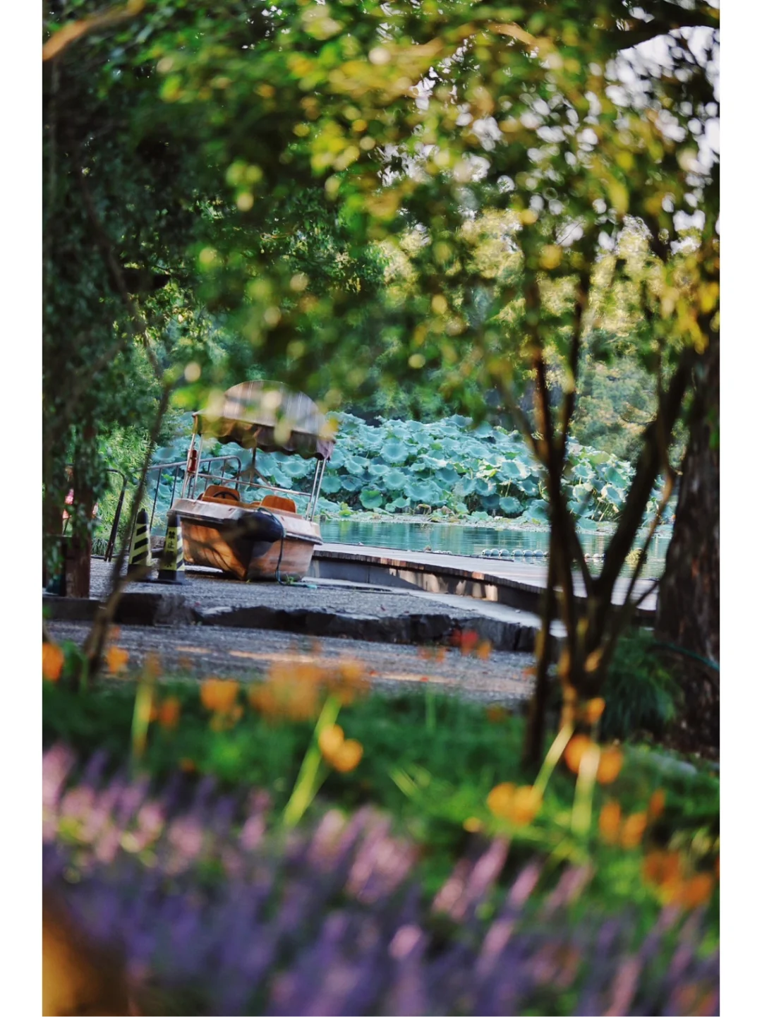 1⃣️刚走进花港观鱼,右边船码头,穿过树林能拍到西湖水面上的船(P9