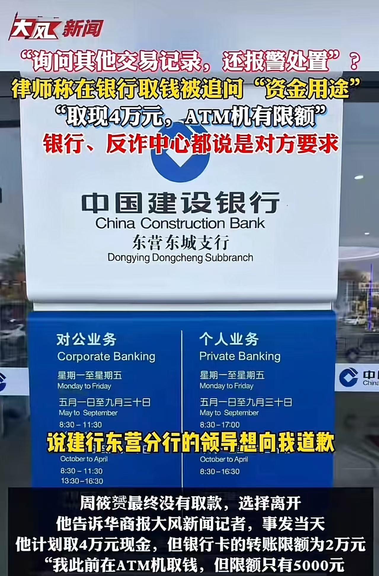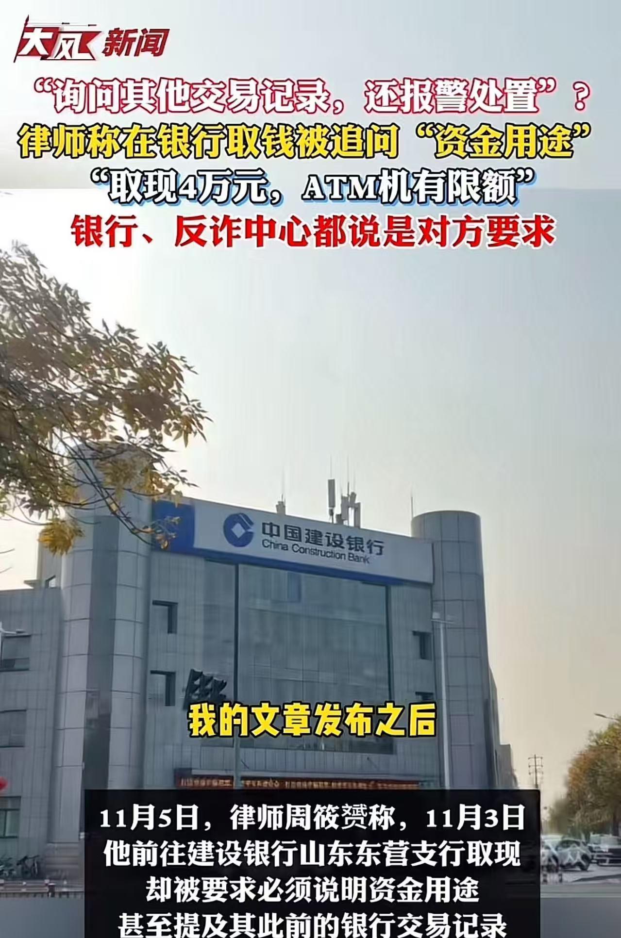 “银行这次碰到硬茬了!”山东东营,律师去银行取4万现金,被追问“资金用途”,律师认为这侵犯自己的隐私权,拒绝告知,银行竟然报案处置!律师这下忍不了,把这事情发到了网上,银行领导低头道歉,但律师觉得事情还没完…… 11月3日,是个普通的工作日,山东东营的中国建设银行东城支行,却因为一场看似简单的取现操作,引爆了公众对银行权责边界的集体焦虑。 律师周筱赟本打算取出4万元现金参加朋友婚礼随礼,却没想到被银行一连串的“盘问式”操作打断了原本平静的行程。 更离谱的是,银行在他拒绝透露资金用途后竟然报警。 一场原本属于个人隐私范畴的金融交易,竟然在银行眼里变成了“待核查的风险行为”。 有人说,银行是为了防诈骗,出发点没错。但问题是,银行不是公安,不是检察院,更不是法官。 它没有执法权,却用“反诈”当挡箭牌,把每一个来取钱的储户当成“潜在罪犯”,要求你“自证清白”。 周筱赟并非普通储户。他是知名律师,曾任《南方周末》记者,专注经济犯罪辩护。 面对银行以“反诈”为名的持续追问,他第一时间意识到,这不是例行公事,而是一种制度性侵犯。 他最初已经表示取款是为了“个人消费”,但银行并不满意,还要他说明具体买什么、给谁、为什么。 甚至还调出其账户过去的交易记录,询问某笔转账的对方是谁、钱是什么性质。 这不是尽职调查,这是调查取证。而银行不是办案机关。 更令人无法接受的是,在周拒绝配合后,柜员居然以“反诈流程”报警,并要求等待反诈中心出警。 半小时过去了,警察没来,银行领导却现身“变通”处理,表示可以放行。 但周筱赟拒绝了。他不愿意在这种规则完全不透明、权力随意变通的环境中继续妥协。 他离开了银行,带着愤怒和困惑,把这件事完整发到了网上。 一石激起千层浪。 11月5日,周筱赟在社交平台公开此事,迅速引发舆论关注。 大量网友对银行的“层层加码”表达愤怒,认为这种做法已经不是防诈骗,而是侵犯基本权利。 更有不少人留言称自己也曾遭遇过类似经历:取款被问东问西、转账被扣留、开卡被要求无犯罪证明,甚至连寄快递都要解释用途。 银行最终低头。东营建行通过中间人向周筱赟道歉,但他拒绝接受。 他在回应中明确指出:这不是一句道歉就能解决的事情,这是机制的问题,是权力边界的问题。 而这正是关键所在。 我们必须面对一个现实:银行不是执法机构,却在执行近似执法的行为。 更讽刺的是,东营市反诈中心明确回应,他们没有设定具体金额门槛,银行应根据账户行为自行判断,且不得阻碍用户正当业务。 也就是说,银行所谓的“上级要求”,其实根本站不住脚。这不是政策执行,这是责任转嫁。 银行作为金融服务机构,当然有责任防范风险,但这份责任不能建立在侵犯用户权利的基础上。 更不能用“安全”之名,行“越权”之实。 在这场风波中,周筱赟的坚持不仅是为了他个人的尊严,更是对整个金融系统边界的一次敲问。 如果不是他是一名专业律师,如果不是他敢于曝光追责,我们是否会意识到自己在银行面前居然是“有罪推定”? 银行不是执法机关,公民不是嫌疑人。反诈无错,但不能无边。这个底线,必须有人来守。 如果连取钱都要“自证清白”,那我们离自由交易的金融环境还有多远?如果每一次柜台操作都像一次审讯,那我们离信任机制的崩塌还有多久? 这一次,银行碰上了硬茬。可真正该“硬”的,不应该是银行的怀疑,而是规则的底线,和公民的权利。