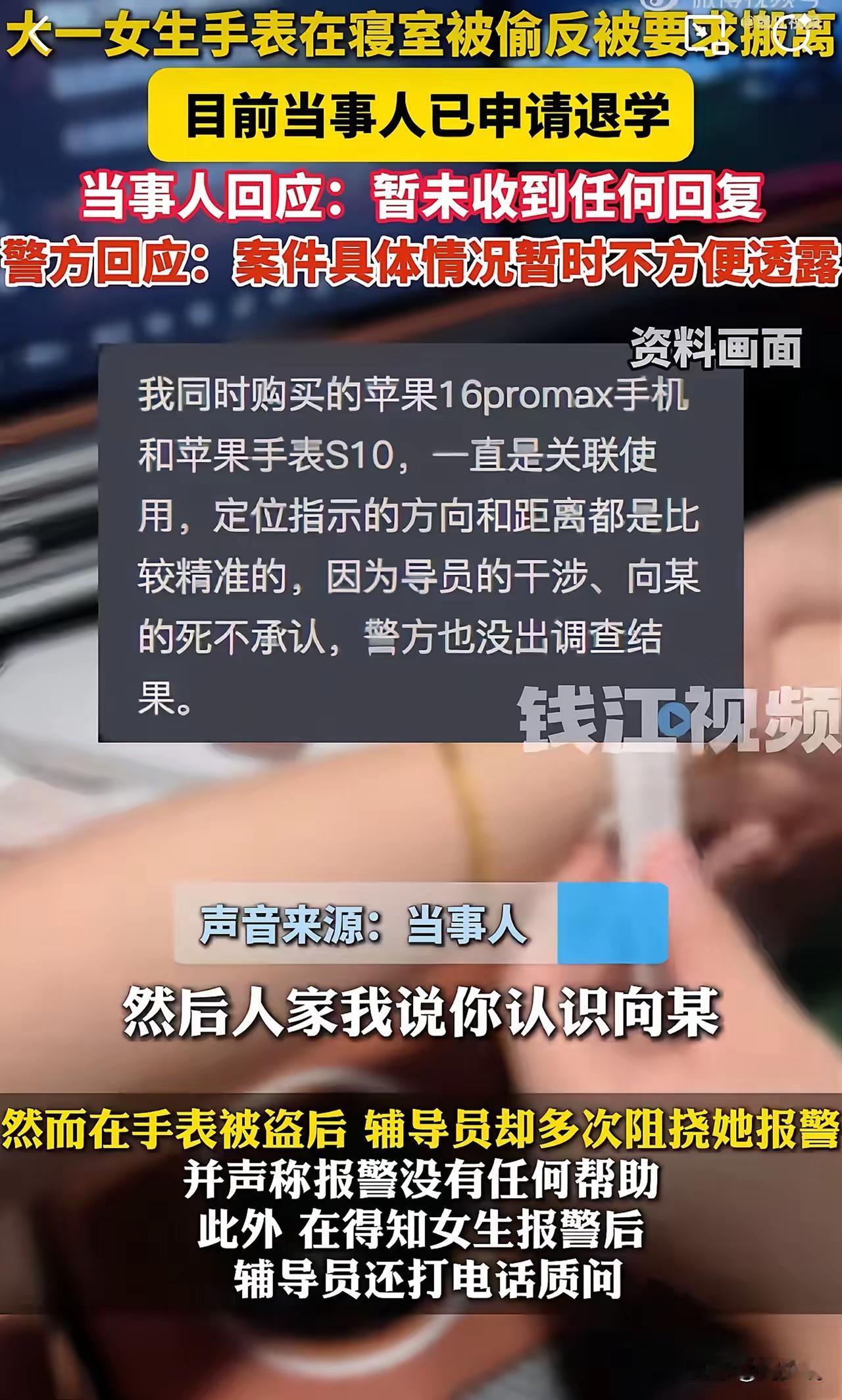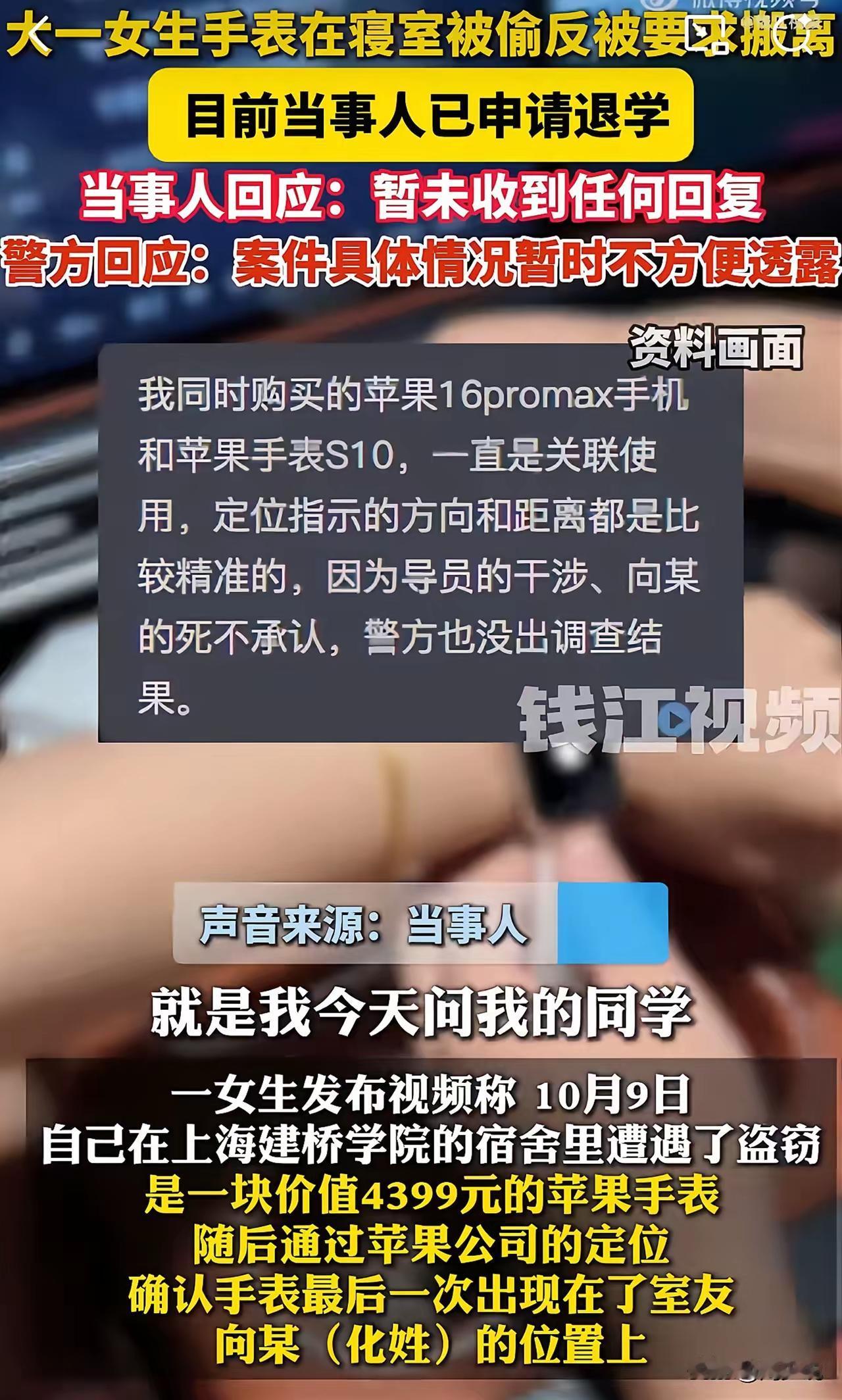 到底意欲何为? 上海一高校惊现离谱事!大一女生宿舍4399元苹果手表被盗,凭定位锁定室友,辅导员却阻挠报警、反逼她搬离,最终女生无奈退学,还被扣除5千余元费用,引发全网热议! 有网友表示: 怕宣传出去有损学校形象,这个学校不上也罢,但必须让全国人民都知道,以后避免其它学生掉坑里。 ①要么有后台②要么学校收不到学生,才不敢管理小偷③没想到[笑哭]没想到遇到小祖宗了→退学!曝光了……[点亮平安灯] 连学校都这种风气,为了稳定好看,不处理产生问题的根源,而是处理发出声音的受害者,最终结果违背逻辑,结果邪恶。 这学校难道不是在中国,不归中国管吗,要不然这个导员跟向某是一伙的。 对此,大家怎么看这个事呢?