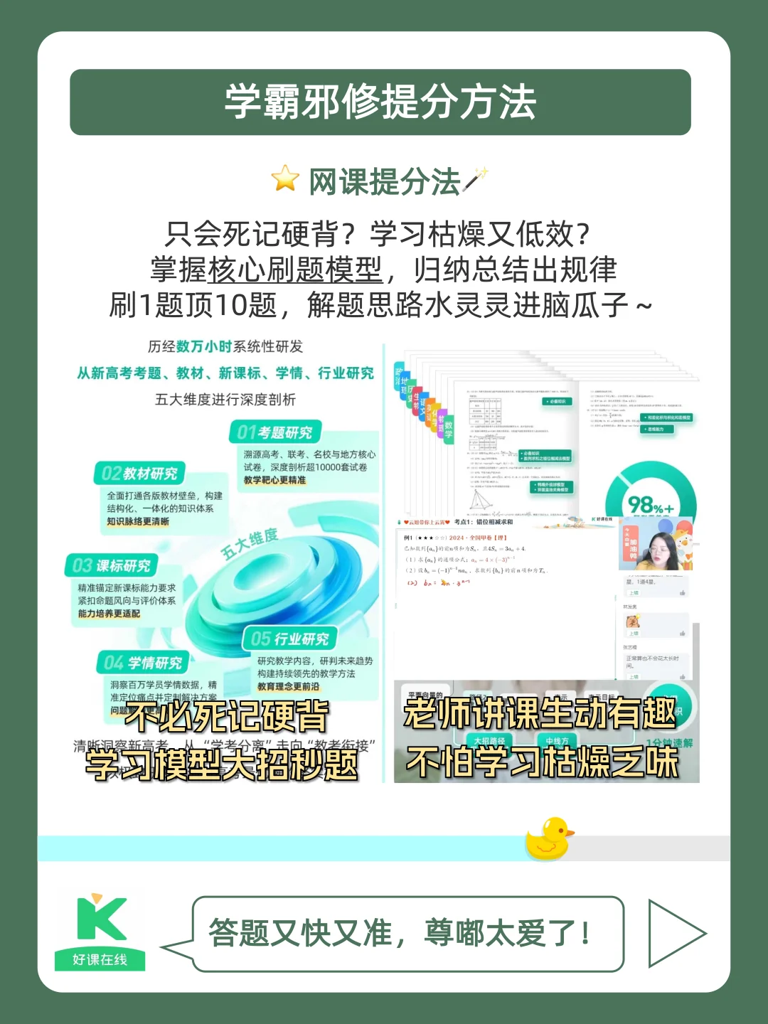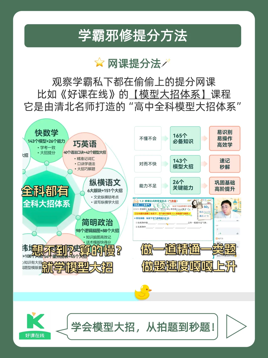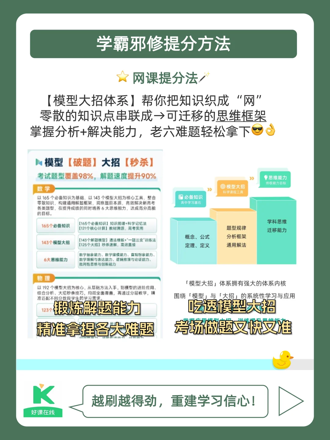 [向右R]应对新高考新课标,“死记硬背就能拿高分”的时代已经过去了。学霸私底下不会死磕浪费时间,都会学习网课高效刷题,可以观察学霸私下都在偷偷上的提分网课,比如学习好课在线【模型大招体系】课程,它可是由清北名师打造的“高中全科模型大招体系”。