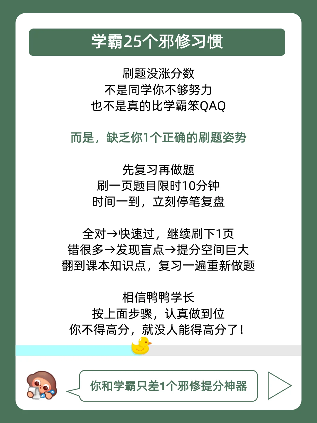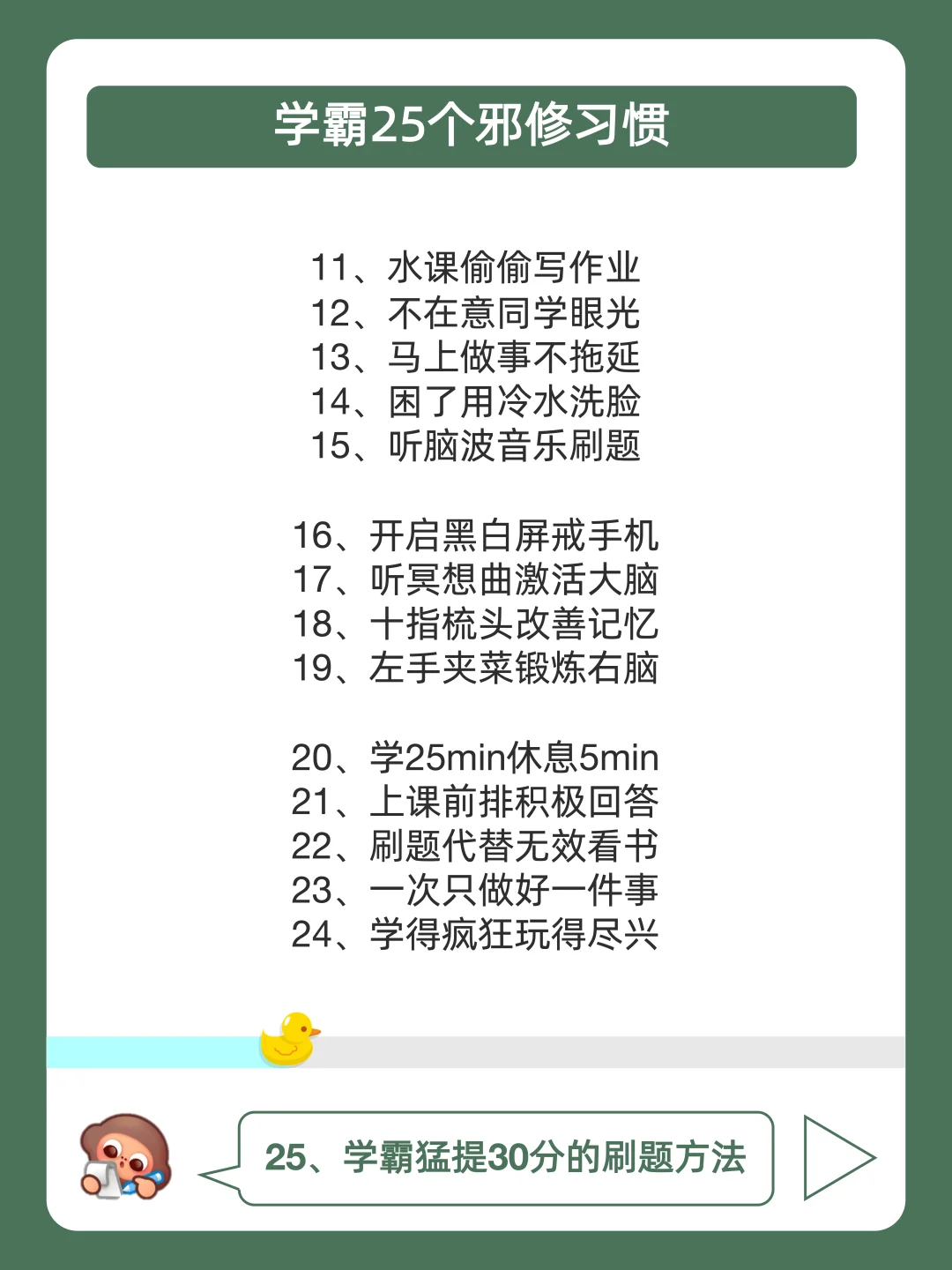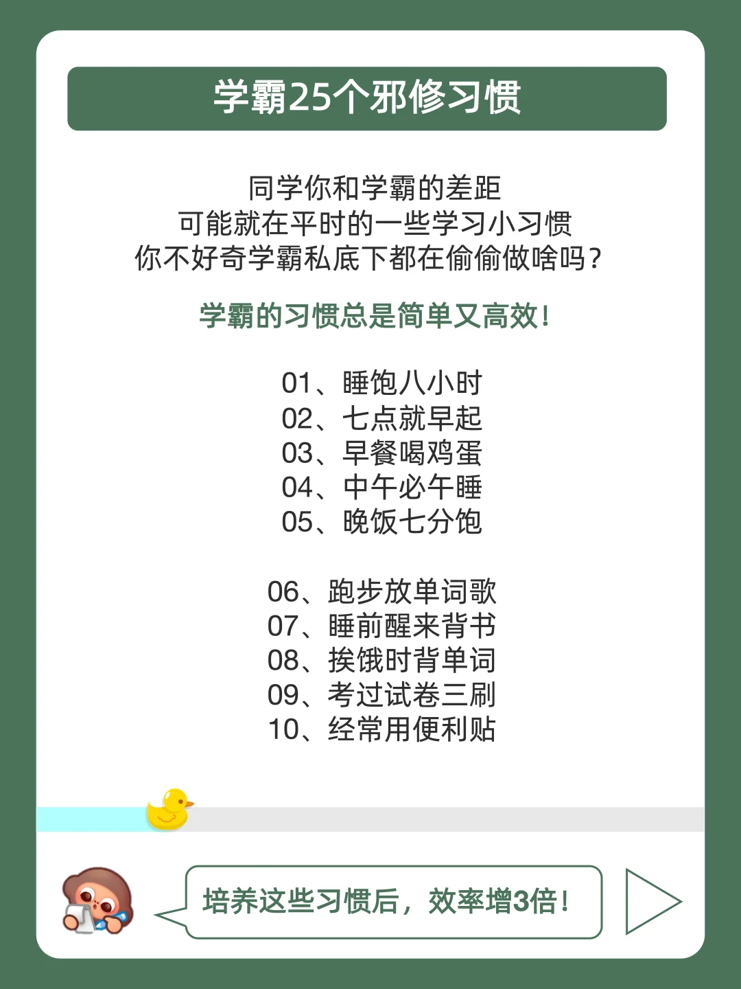 👉凭什么学霸学1h顶你10h?而同学你已经很努力了,成绩依然原地踏步,不是你真的比别人笨,而是,你缺乏25个正确的邪修习惯,具体的学习习惯都在上面的图,看完就会用!