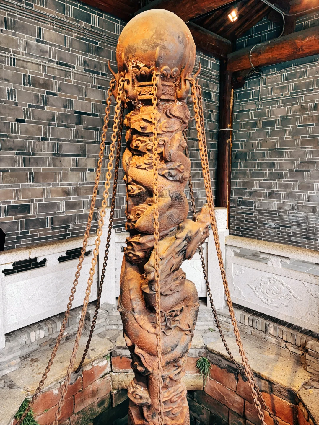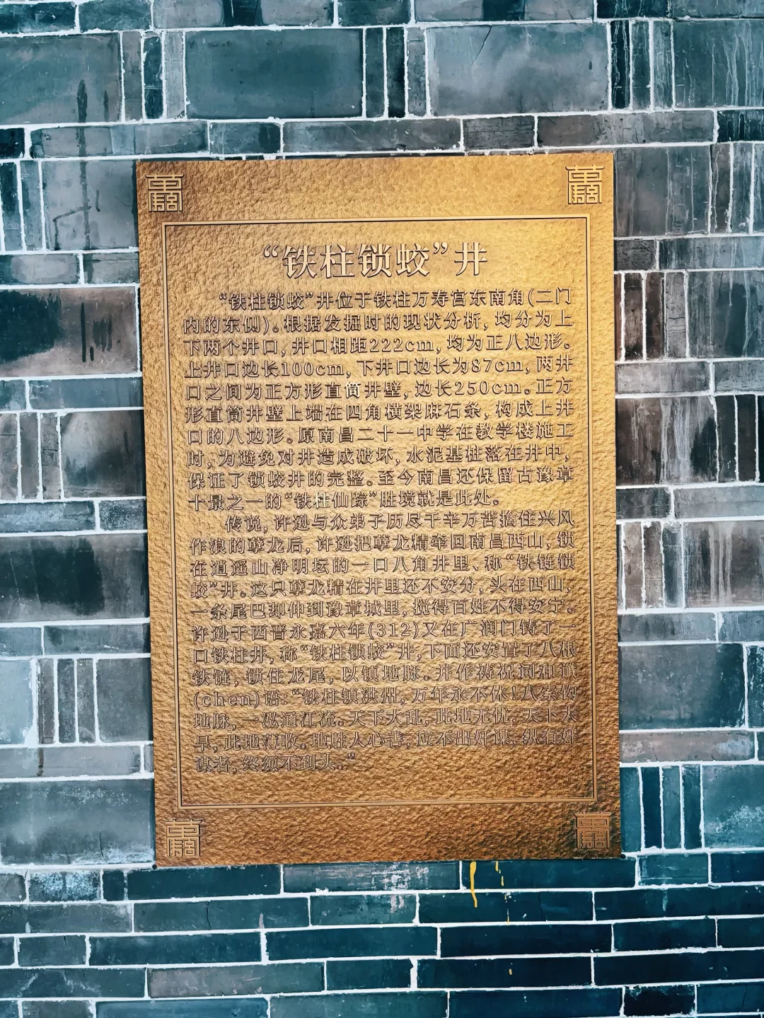 [太阳R]万寿宫内有一口锁龙井(图4️⃣和5️⃣)。相传1600多年前的南昌,有一蛟龙兴风作浪,为害生灵。曾出任蜀郡旌阳令的南昌人许逊,施F术,斗蛟龙,收妖孽,并铸造铁柱将蛟龙锁在一口深井里。