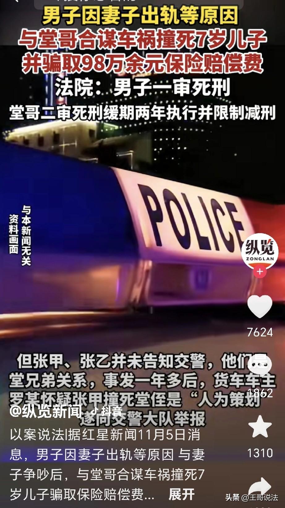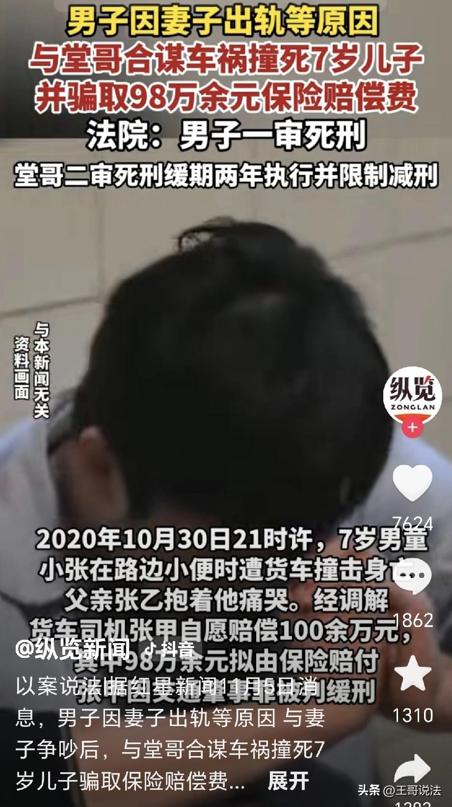 福建三明,一7岁男童在路边小便,被一辆货车撞击身亡,经过调解,货车司机自愿赔偿男孩家人100万元,其中98万元由保险公司赔付,谁知保险拒赔,说货车司机用的假资格证,家属又告车主,车主被判赔偿79万,车主向警方举报,司机和男孩父亲是堂兄弟,他怀疑事故是这哥俩合谋制造,警方抽丝剥茧,真相令人不寒而栗! 张乙和妻子天天吵架,家里没钱,妻子出 轨,日子过得一地鸡毛。 张乙憋满怨气,却没想着好好解决问题,反倒被钱迷了心窍,他天天琢磨挣钱的事情。 他看着7岁的儿子,突然冒出个可怕的念头,他要假造车祸,撞死儿子小张,这样就能骗到巨额的保险金。 2020年9月,张乙找到以前雇自己开挂车的老板叶某,他编了个瞎话,说儿子小张得了重病。 他要叶某开车,将小张撞死,等拿到赔偿,分给叶某一部分钱。 叶某一听,惊掉了下巴,坏良心的事坚决不做,张乙看他拒绝,只好提出,让他千万不要告诉别人。 张乙并没有打消念头,转头就找了堂哥张甲,张乙先说小张重病,不如一了百了,还能获得巨额赔偿。 张甲一听,能分到钱,他思索片刻,答应和张乙一起制造交通意外。 张甲也是大货车司机,他是张乙通过叶某,介绍给老板罗某开大货车的。 2020年10月底,张甲接到罗某的出车通知,机会来了,他立刻给张乙打去了电话。 两人约定,当晚就实施计划,他们选好了作案地点,在尤溪县城关镇埔头村的G235国 道。 那条路地处偏僻,晚上没什么行人和车辆,还没有监控,正是他们眼里完美的作案地方。 10月30日晚上9点左右,张乙开着小轿车,带着懵懂无知的儿子小张。 他来到约定地点,把车停在路边,让小张从车辆左侧下车,到车尾小便,小张乖乖照做,解完手后,站在车尾左侧等着爸爸。 可他不知,亲生父亲正等着堂叔的车前来害他,9:10分左右,张甲驾驶着重型厢式货车,呼啸而来,径直撞上轿车的尾部。 小张也被撞倒,当场就没了气息,张乙立刻扑了上去,抱着小张嚎啕大哭。 他一边哭着,一边报警,还联系了保险公司。 面对赶来的交警,兄弟俩心照不宣,隐瞒了他们是堂兄弟关系。 张甲谎称自己当时低头设置导航,没注意到前方的车辆和孩子,这才引发了追尾事故。 一名路过的摩托车司机也作证,看到孩子在车后被撞。 交警最终认定,张甲负事故全部责任,经过调解,张甲承诺赔偿小张家属100.5万元。 其中98万多元由保险公司赔付,张乙向张甲出具了谅解书。 2021年1月,张甲因交通肇事罪被判有期徒刑一年二个月,缓刑一年六个月。 同年2月,保险公司支付了18万交强险赔偿金,张乙拿到钱后,分给了张甲3万。 张甲张乙满心欢喜,本以为他们做的天衣无缝,可没有料到,保险公司在核查发现,张甲的道路运输从业资格证是假的,因此拒赔第三者责任险。 张乙见拿不到钱,2021年3月,张乙把保险公司,张甲和车主罗某告上了法庭,要求赔偿87万。 2021年12月,法院判决,由车主罗某赔偿张乙79万余元。 罗某一脸懵圈,这事怎么扯到了自己身上,他明明啥也没做,怎么就要赔偿79万? 他实在想不通,就找朋友叶某吐槽烦恼,叶某听说之后,觉得这事太不公平。 他说出了实情,当初张乙找过他合谋杀子骗保,被他拒绝,张乙还叮咛他说,要他千万不要告诉别人。 事故发生之后,叶某一度怀疑就是张乙和张甲故意制造的交通事故,张乙还找过他一次,说儿子被撞,并不是他干的。 张乙再次叮咛他不要说出去,叶某怕被哥俩报复,事后并没有多说什么。 但是这次,法院判罗某赔偿79万,他觉得太不公平,因此愤愤不平,才将此事告诉了罗某。 2022年3月,罗某举报张乙和张甲,线索很快被移送到刑侦大队,警方立刻展开了调查。 2023年4月,张乙和张甲被抓捕归案,这起隐藏了两年多的杀子骗保案,终于真相大白。 《刑法》第232条规定: 故意杀人的处死刑、无期徒刑或十年以上有期徒刑。 张乙、张甲为骗保蓄意杀害7岁儿子小张,违背人伦,罪大恶极, 《刑法》第198条规定: 投保人故意造成被保险人死亡骗保,同时构成其他犯罪的数罪并罚。 张乙张甲编造事故骗取保险金,既犯故意杀人罪,又犯保险诈骗罪,应两罪并罚。 二人合谋策划、分工实施犯罪,张乙提意、张甲执行,二人均是主犯。 2024年6月,一审判决:张甲犯故意杀人罪、保险诈骗罪,决定执行死刑,缓期二年执行,限制减刑,并处罚金3万元,退赔被害人某保险公司3万元。 同时,张乙也被判处死刑。 张甲不服,提出上诉,二审维持了原判。 张乙不服,也曾上诉,但结果截至目前尚未有明确消息。 这起案件让人不寒而栗,亲生父亲为了钱财,竟然能对年幼的儿子下此毒手,堂哥为了分赃,也不惜沦为帮凶。 他们的贪婪和冷血,毁掉了一个无辜孩子的生命,也撕碎了原本完整的家庭。 关注@王哥说法 多学法律少吃亏!