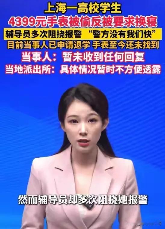 这波操作真看不懂了! 上海某民办学校一女生,在宿舍丢了一块价值4399元的苹果手表。 她几次想报警,都被学校辅导员给拦住了。 学校一直不处理,女生最后还是选择报警。 辅导员反而打电话质问她,并让她搬出现在的宿舍。 原来,她通过苹果公司的定位,发现这块手表的最后位置是同寝室的向某。 而这个向某也非常可疑,因为她曾经偷过东西。 可是不知道为什么,辅导员偏偏有意偏袒向某。 不仅不让报警,还用断电这样的强制方式,逼迫其他人换宿舍。 现在女生的手表仍然没找到,女生也选择退学在家。 除去军训和休息,仅仅上去4天学的她,被学校扣除了5330.6元。 希望学校不要和稀泥,早日给女生一个合理的答复。