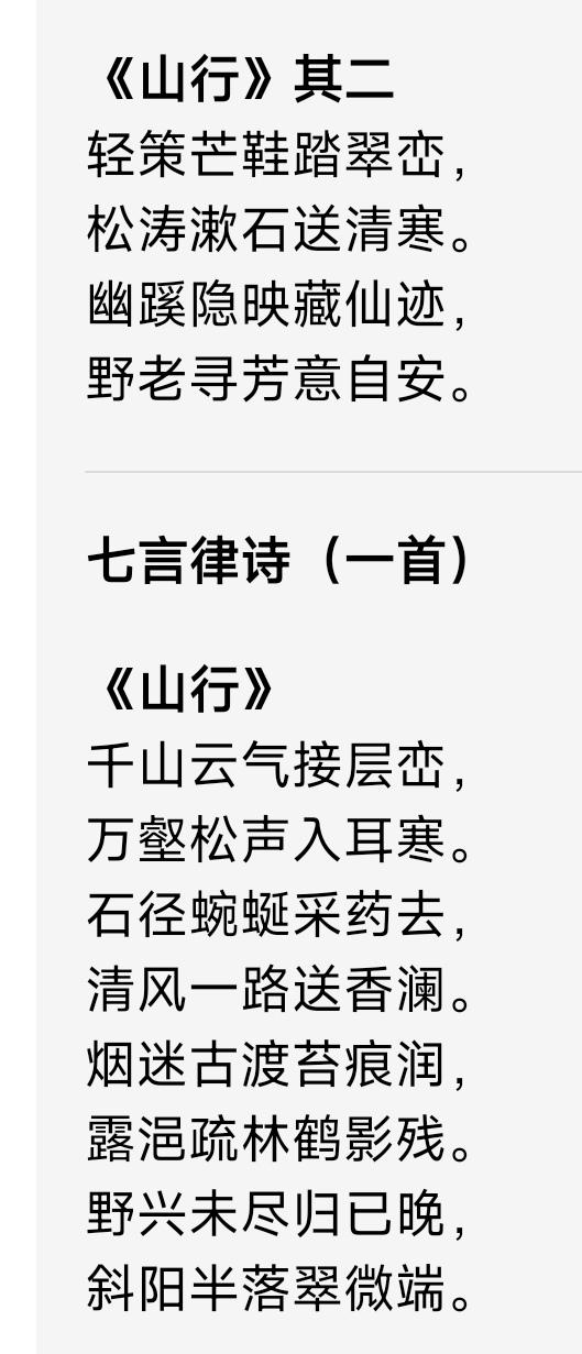 《山行》 山云接远峦,松风入清寒。石径行人去,晴光送碧澜。 七言绝句(两首) 《山行》其一 晓踏晨霜入翠峦,松风拂袖送清寒。石径弯弯藏野趣,山客寻幽意自闲。《山行》其二 轻策芒鞋踏翠峦,松涛漱石送清寒。幽蹊隐映藏仙迹,野老寻芳意自安。 七言律诗(一首) 《山行》 千山云气接层峦,万壑松声入耳寒。石径蜿蜓采药去,清风一路送香澜。烟迷古渡苔痕润,露浥疏林鹤影残。野兴未尽归已晚,