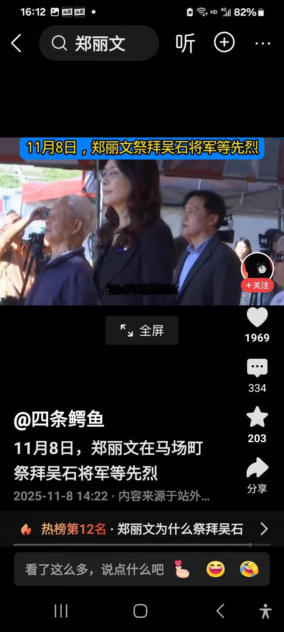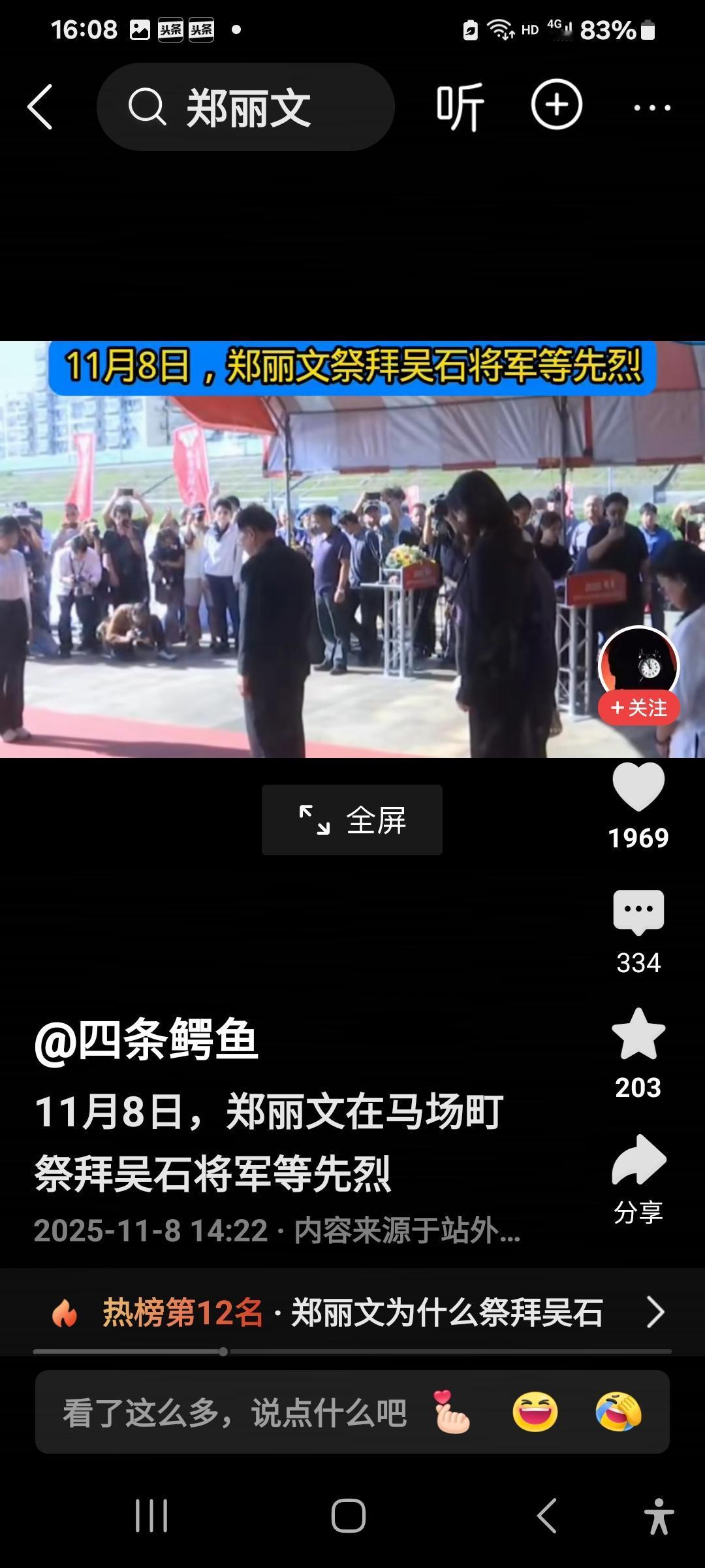 11月8日郑丽文出席祭拜吴石将军等烈士活动,让人敬佩! 活动过程中,主办方称包括吴石将军在内的这些烈士牺牲于五十年代(的台湾),这句话中使用的“烈士”、“牺牲”和“白色恐怖”,令人震撼和欣慰。 更令人欣慰的是,郑丽文出席这个活动,承受了国民党内外,尤其是民进党的巨大压力,说明郑丽文是个有魄力、有担当和为理想信念不屈不挠、勇敢前行的人。 在此,再次向吴石将军等为祖国统一献出宝贵生命的先烈致敬,相信祖国必将也一定会统一!