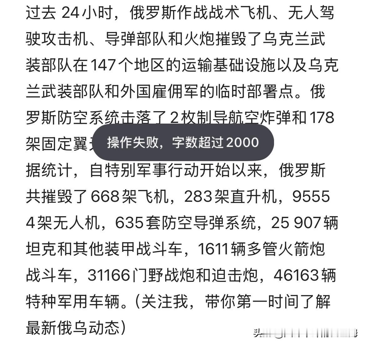 2025年11月8日,俄罗斯国防部24小时最新战报!(截至2025年11月8日13:31莫斯科时间)俄罗斯联邦武装部队继续进行特别军事行动。 乌克兰是否能扭转红军城的战局俄罗斯联邦国防部关于截至2025年11月8日特别军事行动进展情况的报告 为了回应乌克兰对俄罗斯境内平民目标的恐怖袭击,俄罗斯联邦武装部队今天凌晨对乌克兰领土进行了大规模的空中、地面和海上远程精确武器打击。使用了“匕首”高超音速导弹以及攻击型无人机打击了乌克兰军工综合体企业和乌克兰天然气和能源综合体设施。 打击目的已经实现,所有指定目标都被击中。 过去24小时,俄罗斯“北方”集团军的部队在乌克兰苏梅州的霍滕、巴甫洛夫卡、皮萨列夫卡、米罗波尔和普罗莱塔尔斯科耶居民点地区击败了乌军的重型机械化旅、机械化旅、突击旅和两个领土防御旅的编队。在哈尔科夫方向,位于哈尔科夫地区沃尔昌斯克附近的乌军摩托化步兵旅和领土防御旅的分队被击败。乌克兰武装部队损失了195名士兵、3辆装甲战斗车、14辆汽车和7门野战炮。另有一个“格拉德”多管火箭炮系统的战斗车、以色列制造的三个雷达站、一个电子战基站、四个弹药库和八个物资库被摧毁。 俄罗斯 “西部”集团军的分队改善了前线的态势。在顿涅茨克人民共和国的莫纳奇诺夫卡、赫鲁晓夫卡、库里洛夫卡、博古斯拉夫卡、雅罗瓦亚亚亚、诺沃舍利夫卡、德罗比舍沃、马斯利亚科夫卡和扬波尔定居点,乌克兰武装部队的两个机械化突击旅、国防旅和国民警卫队旅的人员和装备遭到打击。 在哈尔科夫地区库皮扬斯克居民点附近,俄罗斯第6集团军突击队继续歼灭被包围的敌军。乌军国民警卫队第1旅的两支部队从哈尔科夫地区奥西诺沃地区发起攻击,企图解除被包围的乌军的封锁。在哈尔科夫地区彼得罗夫卡居民点附近,一支敌军突击队试图突破奥斯科尔河被毁的渡口以修复渡口。 在24小时内,在哈尔科夫州库皮扬斯克附近摧毁了多达55名军人、18件武器和军事装备,包括两辆装甲战斗车、两辆美国制造的155毫米“帕拉丁”自行火炮、七辆皮卡车和四个电子战基站。乌军在“西部”集团军部队的责任区损失了220多名军人,4辆装甲战斗车,包括2辆美国制造的悍马装甲车,23辆车,以及2辆自行火炮和“格拉德”多管火箭炮系统。另有10个电子战基站和3个弹药库被摧毁。 俄罗斯 “南方”集团军的分队占据了更有利的地域和阵地。乌军在顿涅茨克人民共和国塞维尔斯克、兹瓦诺夫卡、康斯坦丁诺夫卡、伊万诺波列、德罗诺夫卡、德鲁日基夫卡和瓦苏科夫卡居民区的三个机械化旅、海军陆战队旅和国防旅的编队被击败。敌人损失了80名士兵、2辆坦克、3辆装甲战斗车、14辆汽车和1门野战炮。摧毁了一个电子战基站、两个弹药库和一个物资库。 俄罗斯“中央”部队集群改善了战术态势。在顿涅茨克人民共和国伊万诺夫卡、第聂伯罗彼得罗夫斯克地区洛佐沃、多布罗波尔、罗迪斯科耶、贝利茨基和新顿巴斯等地,乌克兰武装部队的两个机械化旅、一个骑兵旅、一个突击旅、两个空降突击旅、一个海军陆战队旅和两个国民警卫队旅的人员和装备遭到打击。 在顿涅茨克人民共和国红军城(乌克兰称为波克罗夫斯克),俄罗斯第2集团军突击队继续摧毁中部东部和西部工业区被包围的乌军编队,并清除顿涅茨克人民共和国格纳托夫卡和罗格定居点的乌克兰武装分子。24小时内,有39栋建筑被清理。 俄军击退了来自顿涅茨克人民共和国格里希诺定居点地区的14次敌人攻击,他们试图解除被包围的乌军编队的封锁。由于FPV无人机和火炮的精确命中,火力摧毁了乌克兰坦克和装甲运兵车以及乌克兰武装部队第155机械化旅的人员。乌克兰武装部队第32机械化旅试图向北突破包围圈的企图被挫败。 在顿涅茨克人民共和国的迪米特罗夫定居点,俄罗斯第51集团军第5摩托化步兵旅的分队继续在沃斯托奇尼地区积极进攻。有19栋建筑物从乌克兰武装分子手中解放出来。 24小时内,在顿涅茨克人民共和国红军城和季米特洛夫摧毁了240多名乌克兰军人、一辆坦克、两辆装甲战斗车,包括瑞典生产的PBV 302装甲运兵车和三辆皮卡车。 在“中央”部队集群的责任区内,敌人损失了480多名军人、一辆坦克、两辆装甲战斗车、一辆皮卡车和一个电子战基站。 俄罗斯 “东方”集团军各分队向敌人防御纵深推进,完成了第聂伯罗彼得罗夫斯克地区沃尔奇耶居民点的解放。乌军机械化旅和突击团在亚布洛科沃、里夫诺波尔、扎波罗热地区的特诺瓦特内、维利基米哈伊洛夫卡和第聂伯河地区的定居点被击败。乌军损失了285名士兵、3辆装甲战斗车和14辆汽车。 俄罗斯 “第聂伯河”部队集群在扎波罗热地区的普列夫拉真卡、斯捷普诺戈尔斯克、赫尔松地区的布尔贡卡和蒂亚金卡定居点地区击败了乌军机械化旅、山地突击旅和海岸警卫队旅的人员和装备。俄军摧毁了70名军人、12辆汽车、7个电子战基站和5个弹药库。 (关注我,带你第一时间了解最新俄乌动态)