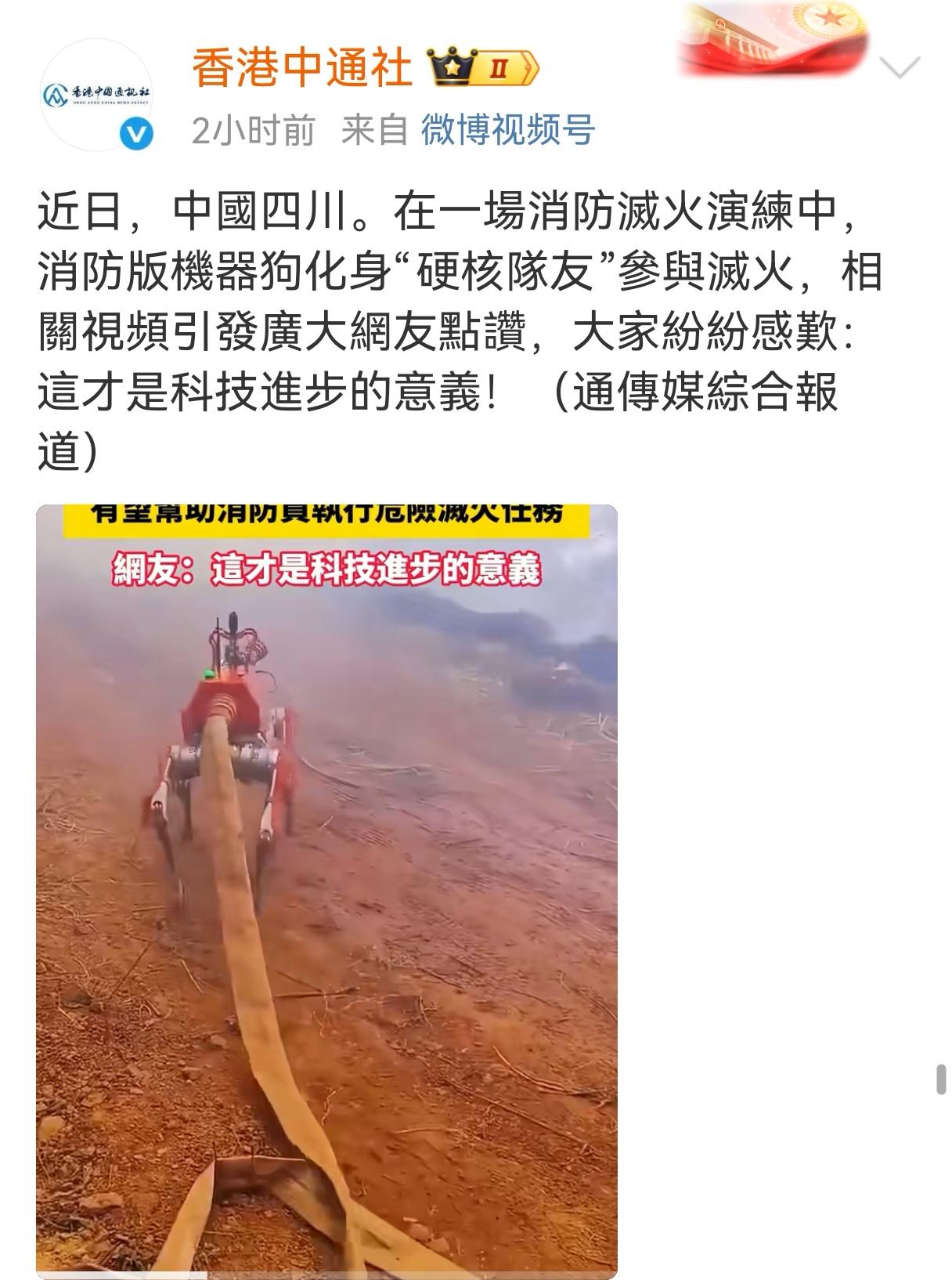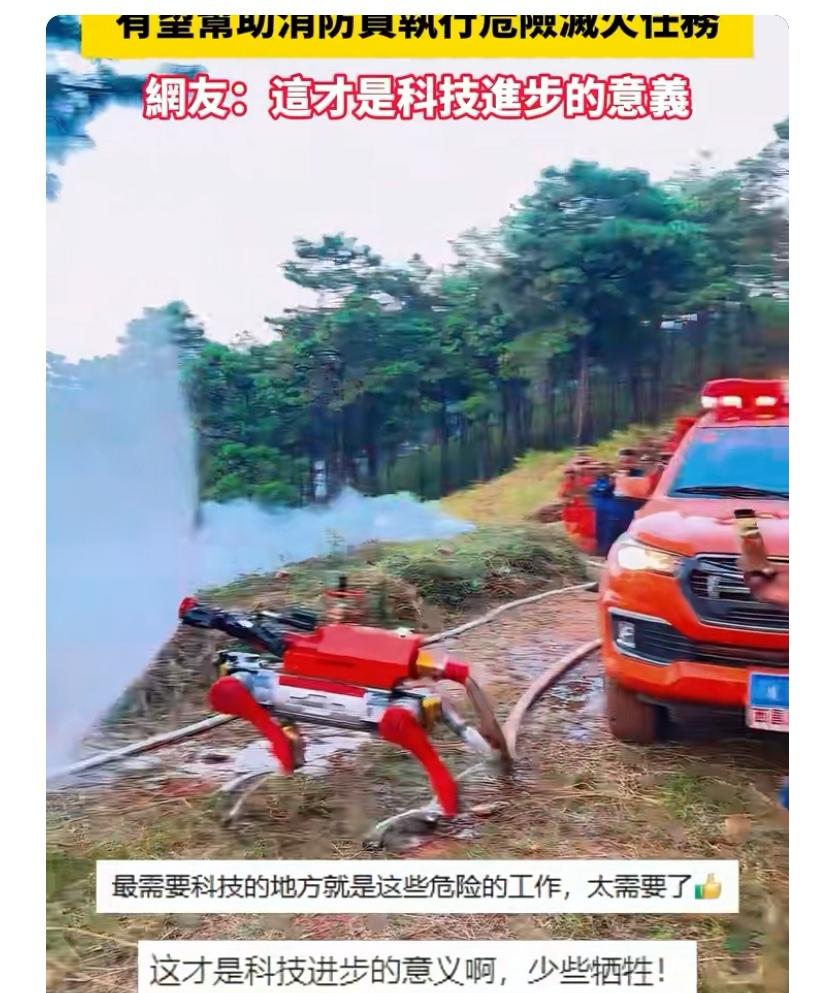 看到中通社的报道,我才知道现在森林消防灭火,我们的消防员可以通过机器狗近距离灭火,而不是以前那样通过消防员自己抵近灭火。真的好喜欢机器狗这样的应用场景,这才是科技进步带给我们实实在在的好处。