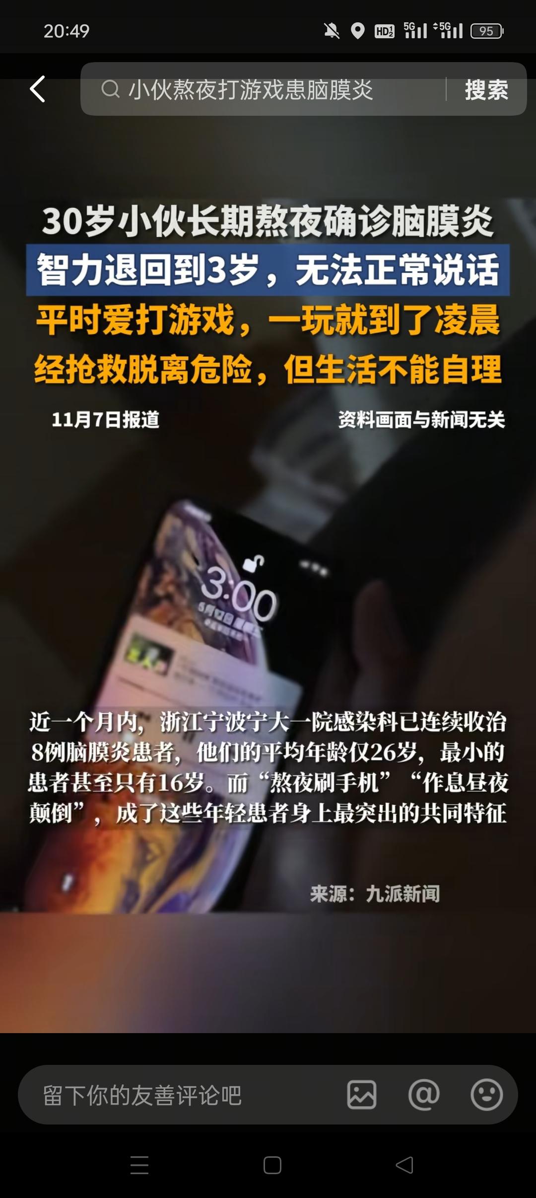 一名男子因为长期熬夜,结果把身体给搞垮了,关键这位男子才30岁,正值年轻,却因为长期熬夜得了脑膜炎,哪怕男子脱离危险了,但他根本无法自理,他的亲朋好友该有多伤心啊。现在很多年轻人都是玩手机熬到深夜,很多年长一辈的人也是这样,玩手机可以,但千万不要熬太久,适可而止,当下手机,到点就睡觉。