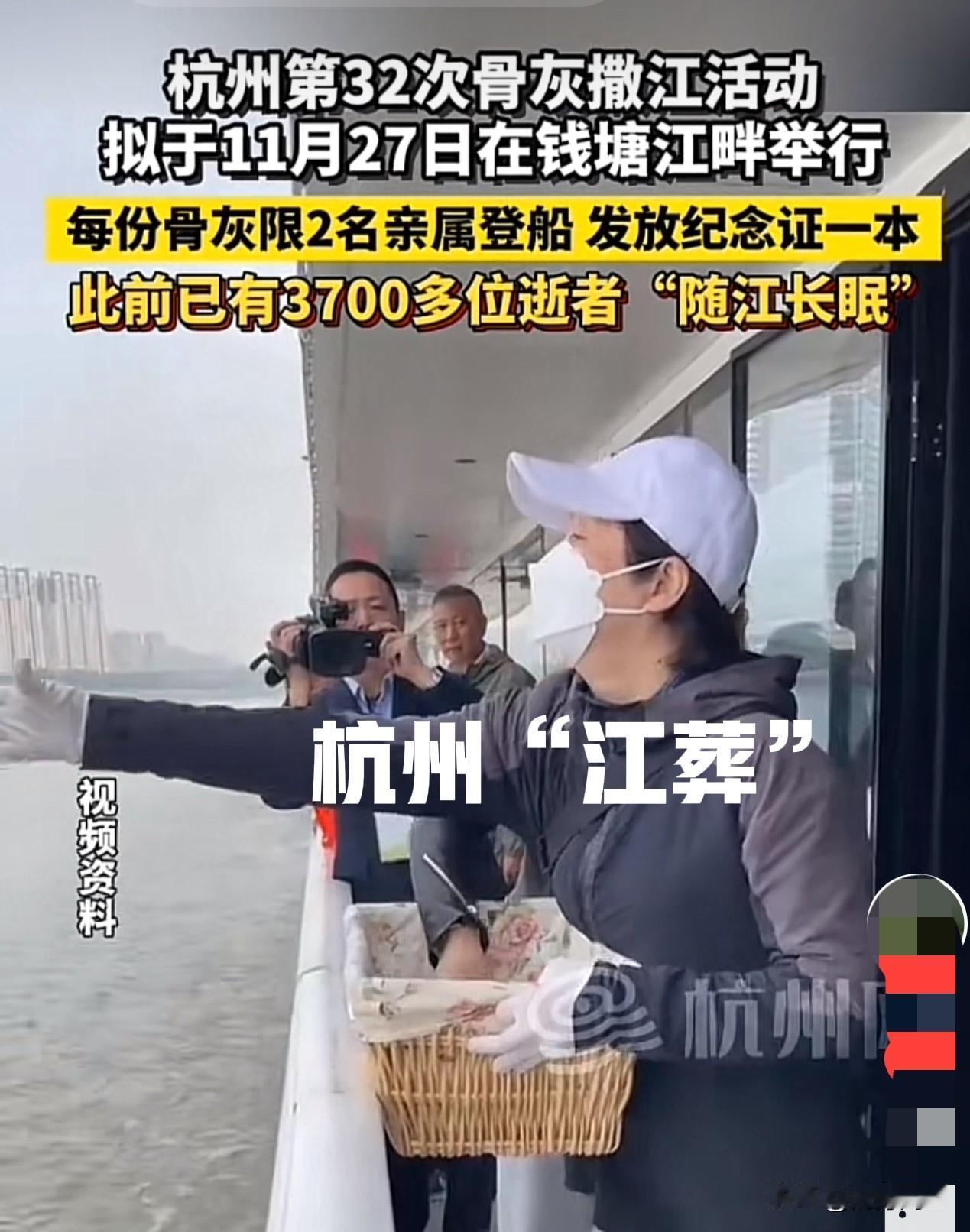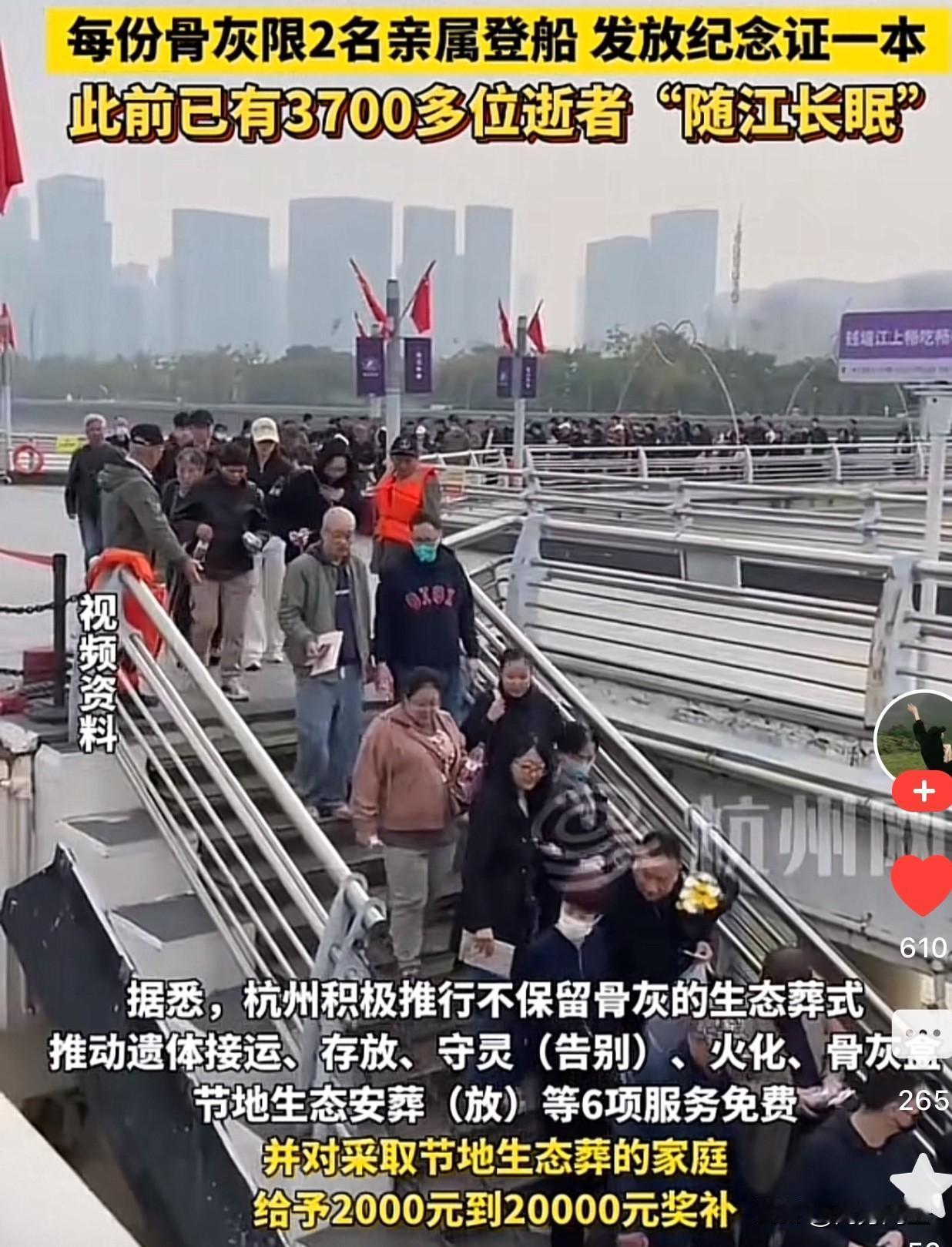 杭州,骨灰撒入钱塘江,这事你怎么看 以前就听说过,有人离世了,骨灰撒入江河湖海。我在心里也曾掂量过,将来自己离世了,搞个树葬或者骨灰撒在某个中意的花园绿地。 如今在杭州,一种新兴的生态安葬方式——江葬,正逐渐被更多人接受。家属在民政部门完成登记预约后,可乘船至指定水域,将逝者的骨灰缓缓撒入钱塘江中。 杭州江葬数量比较稳定。年均200例左右,累计已有3700例逝者随江长眠。 杭州的江葬主要面向本地居民,由相关管理部门选择钱塘江指定水域,体现节地生态安葬趋势。 我觉得这个办法很好。你觉得呢? 骨灰安置方式 江河葬