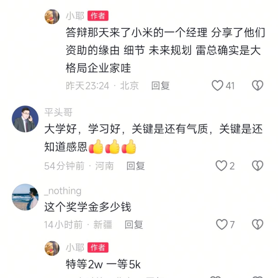 小米基金会搞了很多的奖助学金,雷总也多次捐款母校,这个值得各位企业家学习。[挖鼻][挖鼻][挖鼻]此外,同样多的钱,捐给哈佛最多拿到几个入学名额,但是捐给国内高校,有可能成为校董。