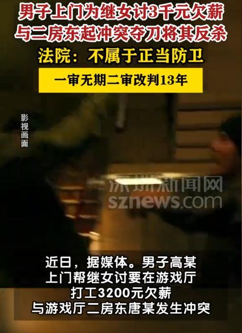 河南鹤壁,一女孩在游戏厅打工1个多月,被拖欠了3200元的工资。女孩向继父哭诉后,继父气得到游戏厅找老板讨说法,期间二人发生肢体冲突。男子先用麦克风支架砸伤了老板的头部,随后老板持刀挥刺反击,在二人争斗期间,继父抢过老板的刀捅向老板致其死亡。一审法院认定男子构成故意伤害罪,判无期。男子不服,认为自己是正当防卫为,于是提起上诉。二审判了!(来源:深圳新闻网,河南省高级人民法院) 据悉,男子高某通过他人介绍,认识了一名带着女儿的女子。二人结婚后,高某就把继女当成了自己的女儿,宝贝得不得了。 继女长大成人后,利用假期去了当地一家游戏厅打工。这家游戏厅在一间商铺内,这间商铺是一名女子租下来的,二层对外出租给人开了游戏厅,一层被女子交给父亲唐某开了饭店。 高某的继女在游戏厅辛苦工作了一个月,结果游戏厅的老板却迟迟不支付工资3200元。 继女回到家后委屈地将老板拖欠工资一事告知了高某,这让高某既心疼又气愤。在安慰好继女后,高某气冲冲地到游戏厅讨薪,但当时游戏厅内没人。 唐某看到高某在楼上游戏厅大闹,于是上楼阻止高某。也许是高某把唐某当成了游戏厅老板,于是二人发生了口角,之后便互殴了起来。 情急之下,高某下抄起电脑旁的麦克风支架,直接砸向了唐某的头部。唐某气得一边向楼下跑,一边捂着头对高某大喊:“你有种别跑”。 高某见唐某要跑,立即追了上去。等二人到了一楼和二楼的楼梯连接处时,唐某看到楼梯处有一把刀,于是拿起刀就向高某挥了过去。 这刀要是真砍下去,后果不堪设想。高某见唐某突然向自己挥刀,吓得立即停住了身形,没有被砍到。 随后高某便再次冲了上去,一把夺过了唐某手中的刀,然后反手在唐某的胸部和腹部捅了几刀。 唐某被刺后忍着疼痛,跑到一层饭店的大厅,然后拿起一把椅子砸向高某,但被高某给挡开了,随后唐某直接躺倒在了地上。 高某见唐某看上去像不行了,于是让饭店的人拨打110和120,他则把刀扔到饭店门外,然后在现场等待民警和医护人员的到来。 可不幸的是,唐某送医后被发现肝脏已经被刀刺破,体内出现大面积出血,后经抢救无效死亡。 案发后,游戏厅老板立即通过微信把3000多元的工资转给了高某的继女。 后在一审法庭上,高某坚称自己是正当防卫。但法院还是认定高某构成了故意伤害罪,判了其无期徒刑。高某不服,提起了上诉。 网友们对此看法不一,有网友认为高某太冤了,人家给继女去讨薪,然后是唐某先拿刀砍人的,高某怎么就不算正当防卫呢? 但也有网友表示,不管怎样拿刀捅死人就是过分了,只是判得的确有些重。 那二审法院会怎么判? 《刑法》第20条规定,正当防卫指的是为了使国家、公共利益、本人或者他人的人身、财产和其他权利免受正在进行的不法侵害,而采取的制止不法侵害的行为。 简单来说,就是当别人正在侵害你的合法权益时,你可以采取合理的手段来保护自己。 本案中,唐某不是游戏厅老板,只是到游戏厅阻止高某大闹,这其实并不算多管闲事,因为游戏厅和饭店就是上下层,在游戏厅闹事也会影响饭店的生意。 而且在唐某和高某因争执转变到动手推搡后,是高某先用耳麦砸了唐某。唐某之后打算下楼喊人,但被高某追急眼了才持刀向高某挥砍。 此时唐某的不法侵害行为属于正在进行时,可高某并没有受伤,他在夺下唐某的刀后,直接捅刺了唐某的身体重要部位。 从这点来看,高某的确不具有正当防卫的特征。如果高某的行为要认定为正当防卫,应当是在夺下刀后,把刀给丢了。 在高某持刀而唐某赤手空拳的情况下,双方所能造成伤害的程度就不平等了。 不仅如此,唐某在被高某捅刺后已经逃到了饭店大厅,但高某仍持刀紧追。 从这点来看,高某真的不具备防卫的意图,他的行为既不属于正当防卫,也不构成防卫过当,而是主观上具有了伤害唐某的故意。 《刑法》第234条规定,故意伤害他人身体的,处3年以下有期徒刑、拘役或者管制;致人重伤的,处3~10年有期徒刑;致人死亡或者以特别残忍手段致人重伤造成严重残疾的,处10年以上有期徒刑、无期徒刑或者死刑。 由于这起纠纷是因民间纠纷引发,而且唐某也不是完全没有过错。除此之外,高某在行凶后,主动在饭店内等待民警赶到,这属于自首行为,到案后也认罪悔罪,积极赔偿被害人近亲属损失并取得了谅解。 最终,二审法院认为一审判决过重,故撤销了一审所判得刑期,改判有期徒刑13年,剥夺政治权利5年。