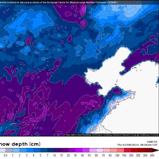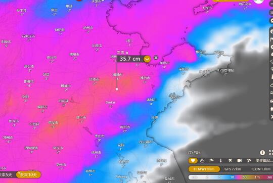今天中午GFS预测冷空气和高空冷槽会加深到极致,东北低槽被切断成滞留槽,冷空气大幅度的增强并推动降水中心南压。从冷空气的发展情况和南方暖湿气流的配合情况来看,GFS预报的这种形势基本很难实现。但是ECMWF预报的大范围30厘米以上极端暴雪的情况也比较难实现,有严重的高估问题,目前来看下调至10~20厘米可能会更接近实际,但总的来说后期降雪的强度并不会小。