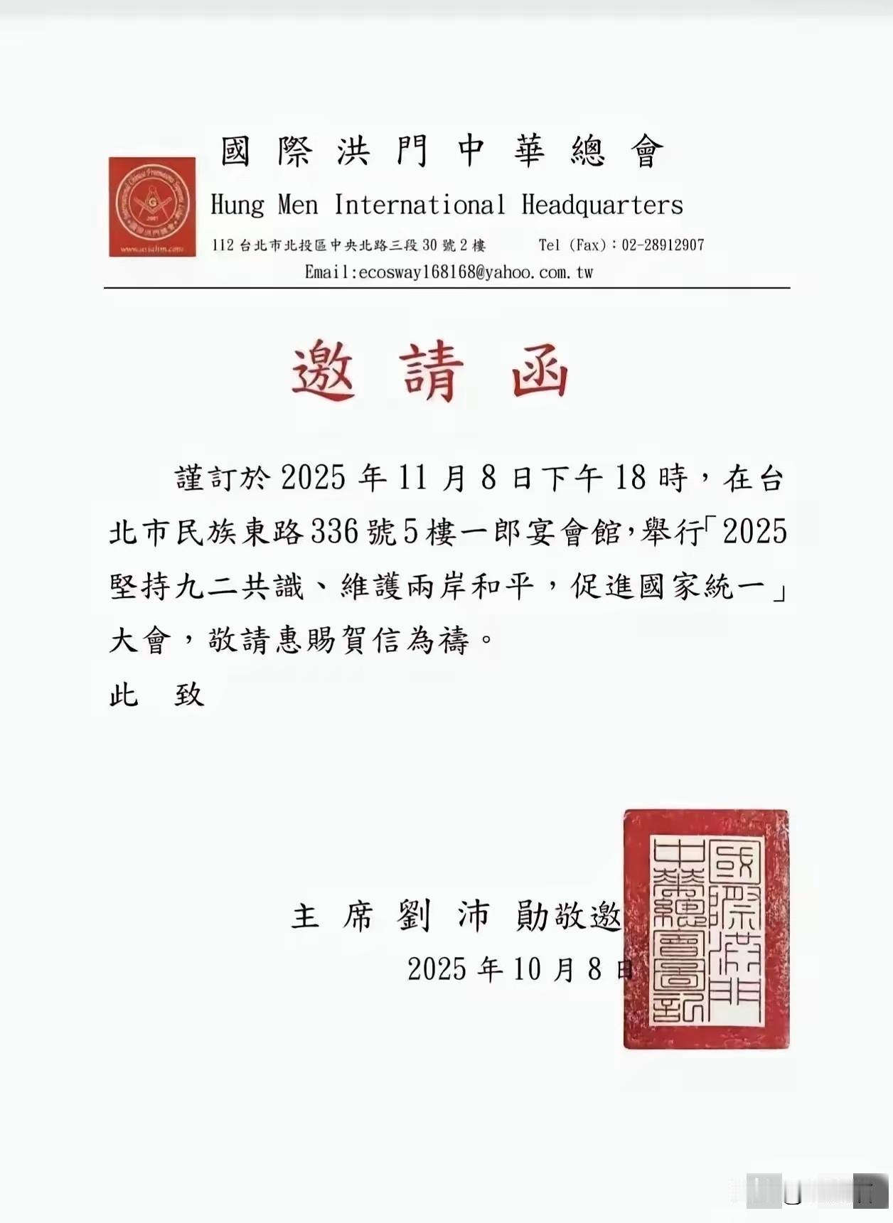 重磅消息!!!国际洪门中华总会主席刘沛勋邀请世界洪门兄弟,于今日下午18时在台北举行【2025坚持九二共识、维护两岸和平、促进国家统一】大会。这洪门可是有着深厚历史底蕴,台湾“国际洪门中华总会”2004年成立,秉持“人道关怀社会服务、复兴民族振兴中华”理念。 2022年佩洛西窜访台北时,刘沛勋就曾掷地有声地表示“台湾是中国的”。他父亲是洪门弟子,抗战时奋勇杀敌,从小就教育他“忠诚救国”。相信这次大会能回顾国家重大历史事件,洪门一直都在为国家统一贡献力量,期待大会圆满成功,推动两岸和平统一更进一步! 洪门这两个字,往历史深处一挖全是热血。从明末清初反清复明的秘密会社,到辛亥革命中孙中山先生依托洪门力量筹措经费、集结志士,再到抗战时期无数洪门弟子奔赴前线血染山河,这个组织两百多年来的命运,始终和中华民族的兴衰紧紧绑在一起。刘沛勋父亲的抗战故事不是个例,史料记载,仅东南亚洪门就曾组织数千华侨机工回国服务,在滇缅公路上运送战略物资,用生命打通了抗战“输血线”。这种刻在骨子里的家国情怀,难怪能让刘沛勋在佩洛西窜台时,不顾岛内分裂势力的压力,直接亮出“台湾是中国的”的鲜明立场。 在当下的台湾,这样的声音尤其难得。看看现在的台当局,一边拿着大陆的经贸红利,一边大搞“去中国化”教育,甚至试图篡改历史教科书,把两岸共同的记忆拆得支离破碎。更可笑的是,某些政客为了讨好外部势力,连“九二共识”都不敢提,却整天喊着“维持现状”的空话,殊不知这种自欺欺人的做法,只会让台湾陷入更大的风险。而洪门这次直接在台北举办统一大会,相当于在分裂势力的“家门口”竖起了一面旗帜,告诉所有台湾同胞:无论分裂势力怎么折腾,两岸同属一中的事实永远改变不了,中华民族追求统一的决心从未动摇。 这次大会的主题“坚持九二共识、维护两岸和平、促进国家统一”,每一个字都戳中了两岸同胞的心声。九二共识是两岸关系和平发展的定海神针,这一点早有公论。这些年,凡是遵循九二共识的时候,两岸的经贸往来就频繁,同胞之间的交流就密切,台湾老百姓就能实实在在享受到好处;一旦偏离这个共识,两岸关系就会陷入僵局,台湾的经济民生也会受到影响。洪门作为一个有广泛影响力的民间组织,主动站出来扛起促进统一的大旗,不仅能带动更多台湾同胞认清形势,更能让世界看到,支持两岸统一是台湾民间的主流声音,不是某些政客能随意抹杀的。 更让人感动的是,洪门的行动从来不是停留在口号上。这些年,他们在台湾积极开展公益活动,帮助弱势群体,推动两岸民间文化交流,用实际行动践行“复兴民族振兴中华”的理念。刘沛勋主席曾说过:“洪门的根在大陆,魂在中华。”这句话道出了所有洪门弟子的心声,也说出了亿万中华儿女的共同期盼。两岸同胞同根同源、同文同种,血浓于水的亲情是任何力量都割不断的。 今天下午的这场大会,注定会成为两岸关系发展中的一个重要印记。它不仅是洪门历史的又一次光荣续写,更是对“台独”分裂势力的有力震慑。期待大会能凝聚更多共识,推动两岸民间交流再上新台阶,让和平统一的种子在台湾这片土地上生根发芽,开花结果。毕竟,只有国家统一了,两岸同胞才能真正实现安居乐业,中华民族才能真正实现伟大复兴!