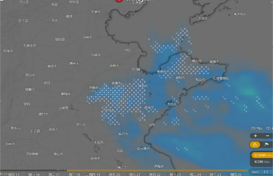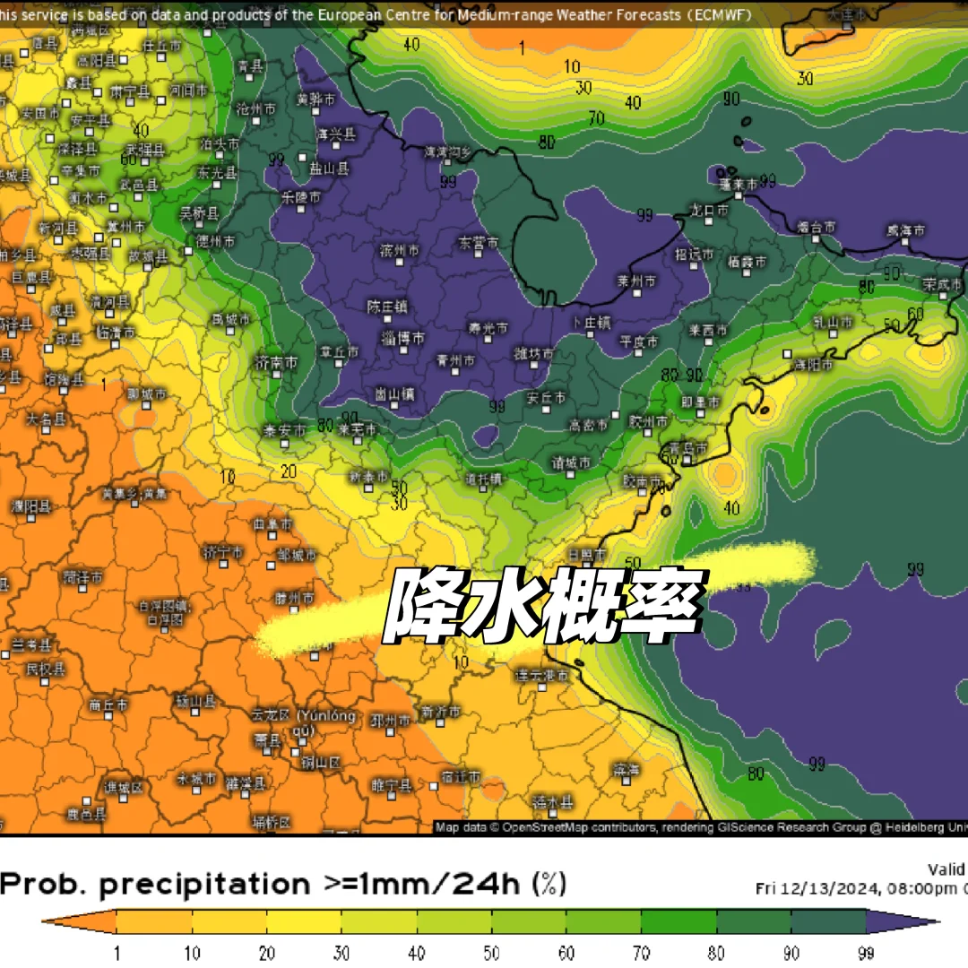 从第三张概率图上看,鲁西北偏东地区、鲁中东部和半岛大部地区都有降雪概率,滨州、东营、淄博、济南东部、德州东部、潍坊、青岛北部、烟台北部附近降雪概率在90%以上。如果条件超预期的话,临沂、泰安、日照、青岛南部地区也有概率出现降雪。