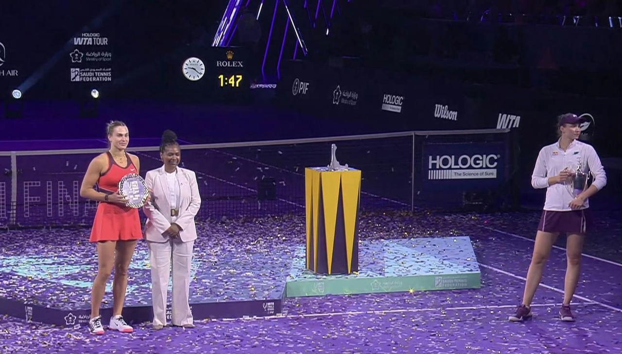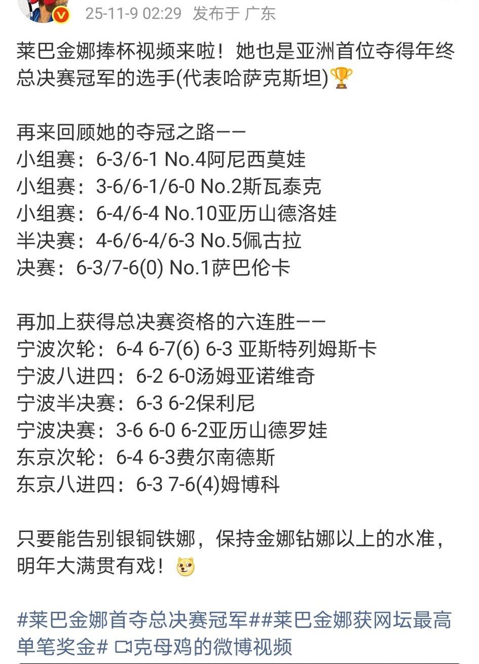 莱巴金娜夺得亚洲第一个年终总决赛冠军!这是一个很长很长的故事,从哪儿开始呢? 从武科夫回来、从朱编剧送走小米辣、从小米辣没能报上东京赛…… 总之:连续两年穿红衣服的都是亚军,莱巴金娜12连胜,而且连续战胜世界前五中的4个,莱巴金娜拒绝跟WTA的CEO合影……