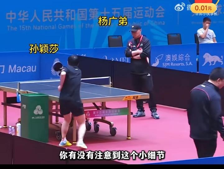 孙颖莎全运会日常! ——启蒙恩师杨广弟全程陪伴,寸步不离[赞]! 昨天下午在澳门结束训练的孙颖莎从车上下来,后面紧跟着师傅杨广弟。 其实莎莎在澳门进行适应性训练的这些天里,一直都是老父亲一样的杨广弟教练在陪伴指导,杨广弟即使在跟别人交谈,眼光也不会离开莎莎。 师徒两个辛苦了,相信孙颖莎能在这奥运会般的全运会上夺冠[奋斗]!