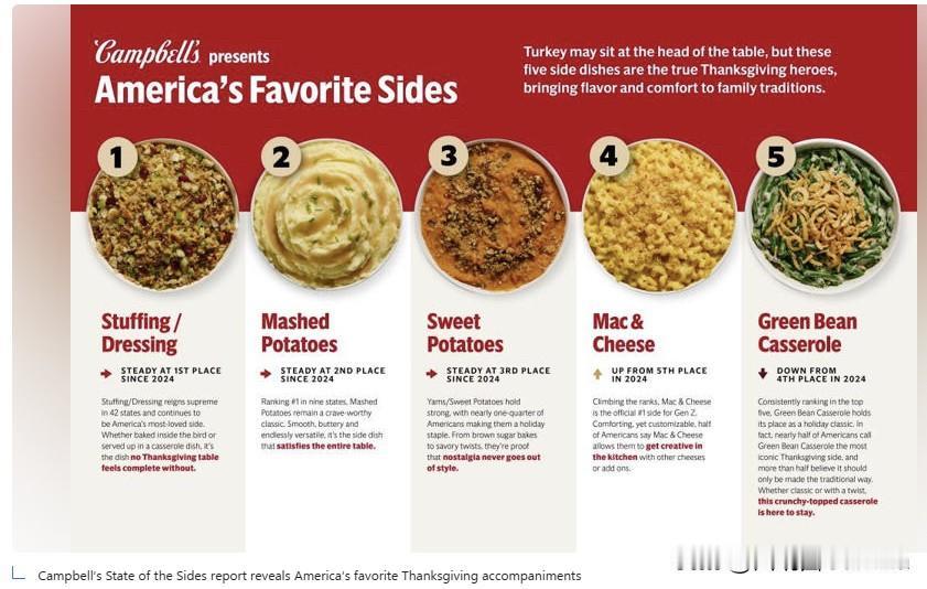 最受欢迎的美国感恩节食品 感恩节,火鸡被盘子旁边的东西抢去了风头。金宝公司的年度配菜状况报告称,美国人比以往任何时候都更热衷于他们的假日配菜。该报告基于对美国50个州5000名美国人的调查,发现63%的人更喜欢配菜而不是熏肉,近一半的人说他们会很高兴满满一盘配菜,根本没有火鸡。81%的人表示,准备配菜是他们表达对家人和朋友的爱的方式——这证明,对许多人来说,感恩节就是关于装饰的。 馅料和调味料是美国人最喜欢的一面在坎贝尔2025年的报告中,馅料或调味品连续第四年成为美国最受欢迎的感恩节食品,在42个州中占据榜首。土豆泥在全美最受欢迎的配菜中排名第二,在包括印第安纳州、堪萨斯州、新墨西哥州和华盛顿州在内的9个州名列榜首。山药和红薯也深受人们的喜爱,尤其是在南方,近四分之一的美国人把它们作为感恩节的主食。 美国健康食品 纽约感恩节 美国食物推荐 美国食品