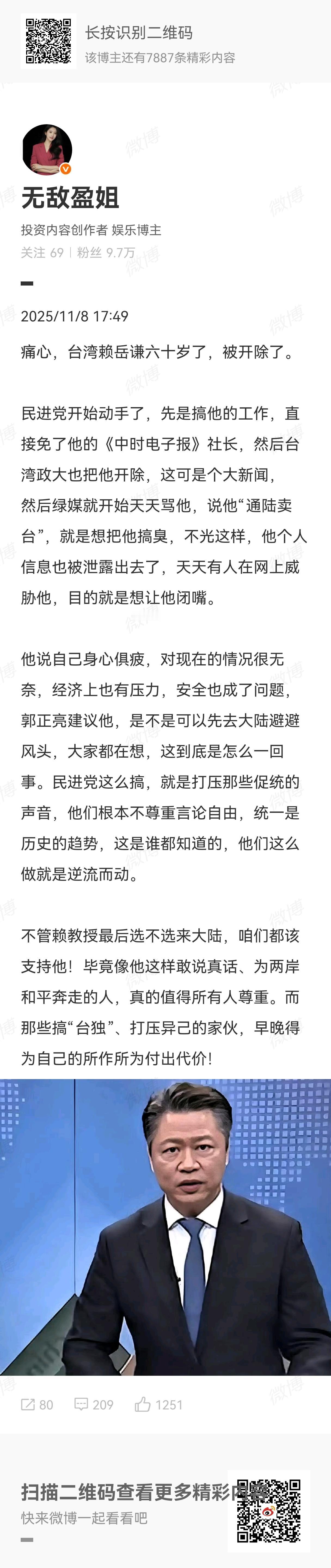 我听郭正亮的节目,也听他说赖岳谦被《中时电子报》和台湾政治大学开除,现在处于失业状态。失去《中时电子报》是想让赖岳谦没有了发声的地方,离开台湾政治大学是想让赖岳谦失去收入来源,这一套是完全复刻了白色恐怖,是想让赖岳谦这样的统派人士感到害怕。赖岳谦夫妇多次表示想到大陆定居,甚至明确表达将宜宾作为定居地。不知道他们夫妻二人长江沿岸行,是不是已经找到了住处。这次被台当局打压,肯定和上个月上杭寻根之旅有关系,正是赖岳谦夫妇的寻根之旅,触发了馆长“帮忙”寻根,让赖哇无地自容。同为“赖”姓,差别如此之大,可能让赖哇也感到一丝羞愧。