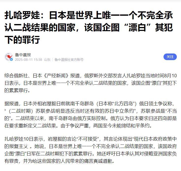 奉劝所有中国人,必须做好心理准备,因为俄罗斯外交部发言人扎哈罗娃说出了事实。 扎哈罗娃说:日本是世界上唯一一个不完全承认二战结果的国家。这话被日本《产经新闻》一报道,8月10号当天就引起了不小的风波。日本人觉得委屈,心说我都道歉几十年了,怎么就不承认结果了呢?你还别说,当时还有些中国人替他们说话。 日本人口中的“道歉”从来都是模糊不清的文字游戏,要么用“深表遗憾”、“反省”这类模棱两可的词代替“谢罪”,要么把侵略战争说成“进出”,把加害者包装成“受害者”,仿佛当年扛着枪炮登陆亚洲各国是去串门走亲戚。 更讽刺的是,这种廉价的“道歉”还常常随政府换届变来变去,1995年村山富市当首相时,还算说了句实在话,在“村山谈话”里明确承认日本“走上了战争的道路”、“殖民统治和侵略给亚洲各国带来巨大伤害”,还说了“深刻的反省和由衷的歉意”,这本该是日本正视历史的底线。 可没过几年,小泉纯一郎上台,再提历史就悄悄删掉了“国策发生错误”的关键表述,等于把战争责任从国家层面摘了出去。 到2015年安倍晋三更是直白,在“安倍谈话”里扬言“不能让与战争毫无关系的子孙后代负起继续道歉的宿命”,这话翻译过来就是“道歉这事儿到此为止,以后别再提了”。 今年是二战结束80周年,首相石破茂干脆连官方谈话都不敢发,只敢用“个人见解”敷衍,通篇分析“日本为什么走向战争”,对给其他国家造成的苦难避而不谈,连“反省”俩字都懒得提,这哪是道歉,分明是把道歉做成了可回收垃圾,想扔就扔。 光说不练假把式,日本的行动比嘴上的空话更能说明问题。就说靖国神社那地方,供奉着14名二战甲级战犯,这些双手沾满鲜血的人,在日本政客眼里倒成了“英雄”。 2017年春大祭的时候,内阁总务大臣高市早苗直接跑去参拜,还有95名国会议员结伙凑热闹,时任首相安倍晋三虽说没亲自去,却以“内阁总理大臣”的名义供奉了祭品,回头还让官房长官说这是“私人行为”,这种又想当又想立的操作,真是把虚伪玩到了极致。要真承认二战结果,会把甲级战犯当神明供着?这分明是在给侵略历史招魂。 更让人不齿的是,日本连历史教科书都敢动手脚,把“侵略中国”改成“进出中国”,把南京大屠杀的细节大幅删减,甚至有教材压根不提慰安妇问题,活生生把血腥历史改成了温情故事。这种从教育层面篡改历史的做法,比不道歉更恶毒,等于从根上给下一代灌输错误认知,让他们以为祖辈的侵略行为根本不算事儿。 反观那些战争受害者,还在为一句公道苦苦等待。成都大轰炸的受害者苏良秀和达朋芳,一个腿上留着炸弹伤疤,一个手臂终身残疾,当年日军108架轰炸机投下426枚炸弹,夺走了苏良秀7位亲人的命,这样的血海深仇,日本政府却视而不见。 从2006年开始,188名受害者跨国起诉,9年间开了31次庭,日本法院明明在判决书里承认了加害事实,却以各种理由驳回索赔,三级法院一路维持原判,硬是让受害者等了近20年也没等来一句正式道歉,这就是日本口中的“反省”? 二战后制定的和平宪法明确限制其军事力量,可安倍晋三上台后一门心思要“摆脱战后体制”,2014年硬是推动内阁通过决议,修改宪法解释解禁了集体自卫权,把和平宪法变成了一纸空文。 要知道,集体自卫权意味着日本能跟着盟国打仗,这跟二战前的军国主义倾向简直如出一辙,分明是在挑战二战后的国际秩序。当时连日本54%的核爆受害者都反对这事,84.1%的民众觉得政府没把话说清楚,可日本政客压根不管这些,一门心思往危险的路上走。 那些替日本说话的中国人,大概是没见过受害者身上的伤疤,没看过日本法院自相矛盾的判决,更没留意日本政客参拜靖国神社的背影。 日本的“道歉”就像过期的保健品,听着挺像回事,实则没半点功效,还得跟着政府换届不断“更新包装”,本质上就是为了逃避责任。他们嘴上喊着“遗憾”,行动上却在篡改历史、扩军备战,这样的表现,可不就是不完全承认二战结果嘛。
