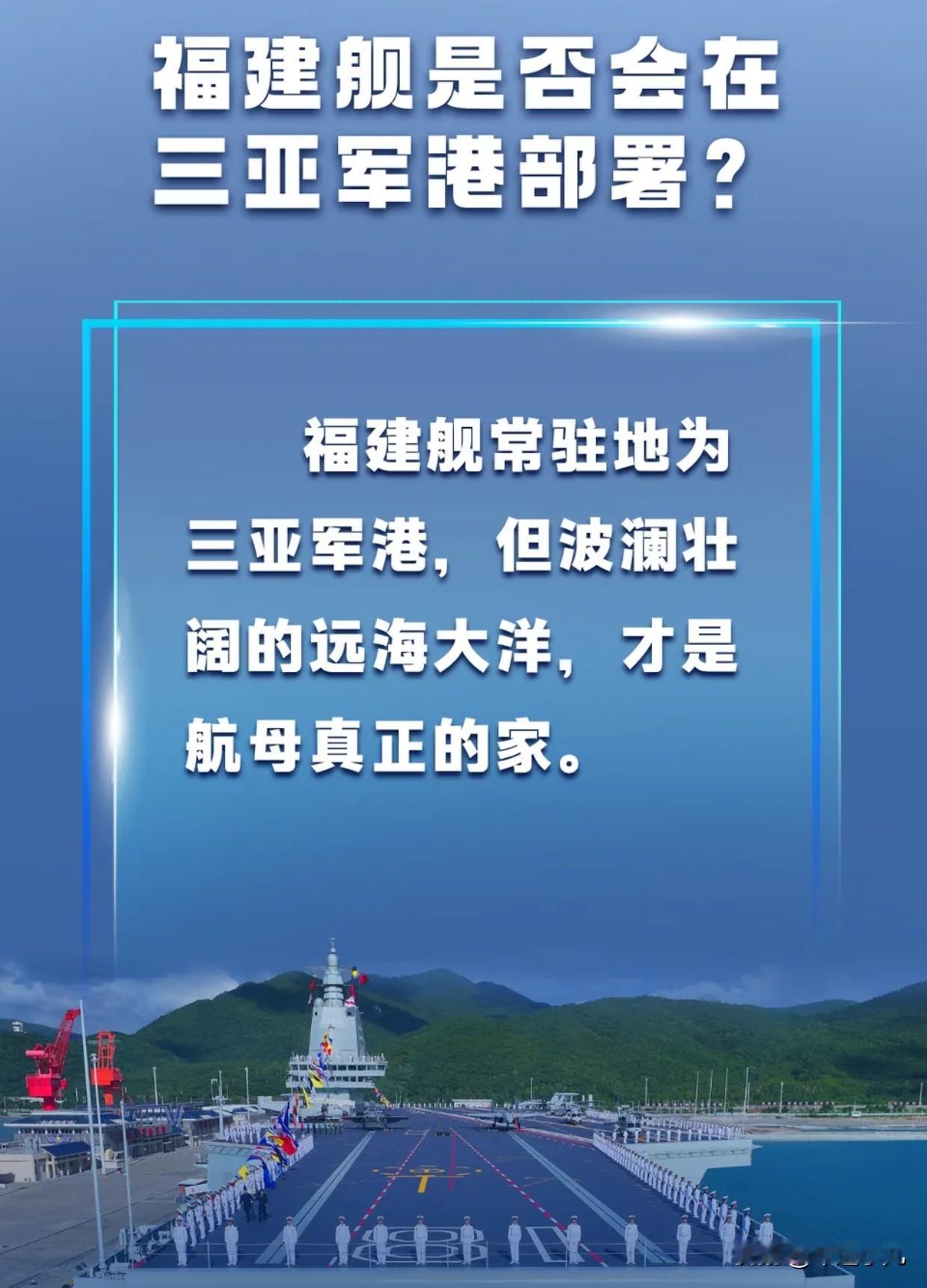 福建舰驻地终于官宣,海军发言人揭开福建舰部署背后的深层考量! 福建舰,自从官宣入列之后,无论是在国内还是国外,都引起了巨大的关注和热议,为此,昨天下午海军新闻发言人就相关问题进行了解答,大家非常关注的就是福建舰驻地在哪里? 发言人也是肯定的进行了回答,称福建舰是海军现役吨位最大的舰艇,综合考虑战备需要、港口条件、保障能力、任务特点等因素,该舰常驻地为三亚军港!同时,也表示波澜壮阔的远海大洋,才是航母真正的家! 福建舰,整整比山东舰大了一圈,先进技术更是数不胜数,未来形成完全作战能力,就是战力最强的航母,那一天应该不会太久! 大家觉得呢?福建舰 福建号航母