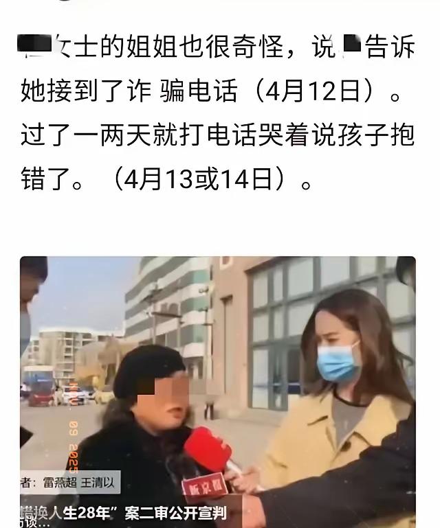 错换人生关键细节曝光!杜新枝早已知情?姐姐采访证词太打脸 翻到错换人生早期采访资料,杜新枝姐姐的一番话直接戳破了关键疑点! 姐姐在采访中明确提到:4月12日妹妹告诉她接到诈骗电话仅过一两天(4月13日或14日),杜新枝就哭着说“孩子抱错了”。 要知道此时许敏姚师兵与郭威的DNA鉴定结果还没出来,夫妻俩更是没登过杜家的门,姚爸仅仅是打电话询问了当年两个孩子的出生情况。 没有鉴定结果佐证没有当面对质核实,杜新枝为何能提前断定“孩子抱错”?答案似乎不言而喻——她对当年的换子事件恐怕早就心知肚明! 更让人不解的是后续DNA鉴定结果清晰出炉,铁证如山之下杜新枝却始终不认可这份鉴定的合法性,百般质疑胡搅蛮缠,无疑是对姚爸当年的善意询问对这份血脉亲情的公然侮辱。 真相不会被掩盖细节里藏着最真实的答案。这样的时间线和证词难道还不足以说明问题吗?欢迎在评论区留下你的看法!