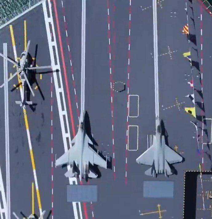 歼-15T和歼-35舰载战斗机俯视图,能看到无论长度方向还是翼展方向歼-15都是明显比歼-35要大的。歼-15最大起飞重量约33吨,官方给出的歼-35最大起飞重量是近30吨,而且是双中推发动机。也就是说歼-35和F/A-18E/F超级塑料虫一样都是无限接近重型机标准的中型机。
