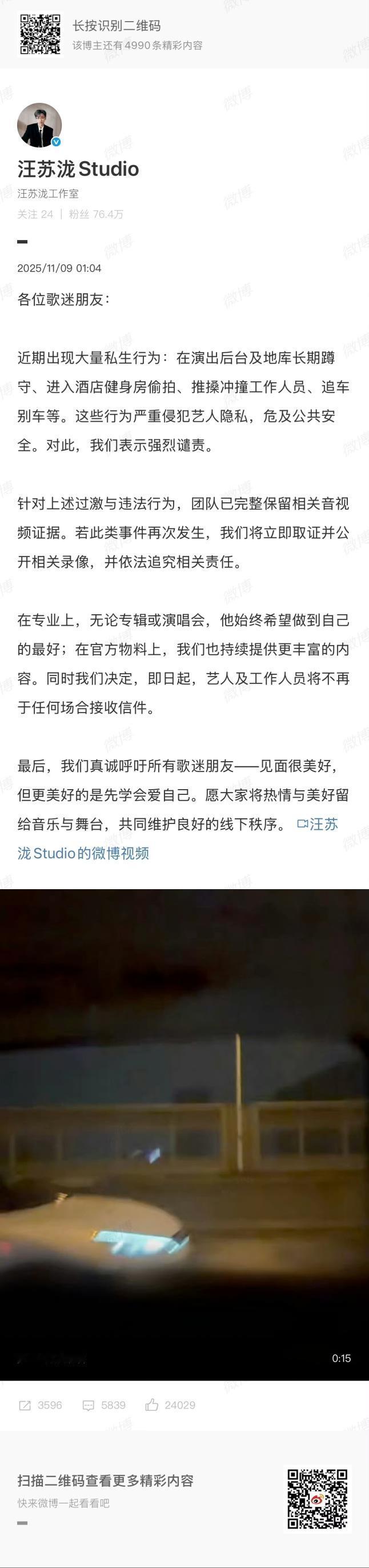 汪苏泷工作室深夜硬核开怼私生!直接甩出视频实锤:蹲守后台地库、酒店偷拍、追车别车,甚至推搡工作人员,这哪是追星,简直是“危险行为大赏”! 工作室明确表态:以后任何场合都不收粉丝信件了!还暖心提醒:一万次见面,该在舞台下、演唱会上,不是在你堵人的地库里!咱就是说,私生饭快醒醒,别把喜欢变成惊吓,给偶像留条活路吧!